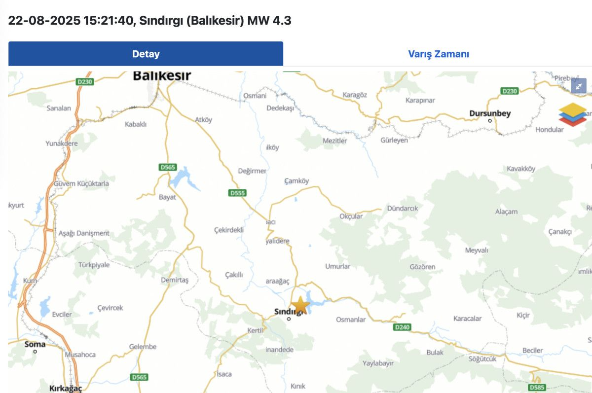 Afet ve Acil Durum Yönetimi Başkanlığının (AFAD) internet sitesinde yer alan bilgiye göre, merkez üssü Sındırgı ilçesi olan 4,3 büyüklüğünde sarsıntı kaydedildi.