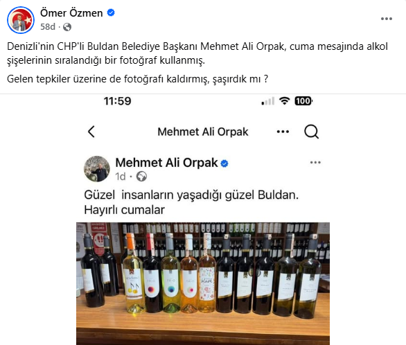 CHP’li Buldan Belediye Başkanı Mehmet Ali Orpak, cuma mesajında alkol şişelerinin sıralandığı bir fotoğraf kullandı. Orpak’ın paylaşımı sosyal medyada birçok kullanıcı tarafından eleştirildi. Paylaşım kısa sürede kaldırılırken, olayın yankıları siyasetten sivil toplum örgütlerine kadar geniş kesimlerde tepkiyle karşılandı.