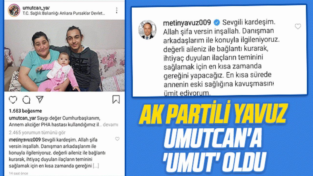 Metin Yavuz, Umutcan’ın bu yardım çağrısına sessiz kalmayarak aileye destek olacağını söyledi. Zaman kaybetmeden danışmanları ile birlikte aile ile Milletvekili Yavuz konuyla yakından ilgileneceğini belirterek geçmiş olsun dileklerini iletti. AK Partili Yavuz, sosyal medya hesabından yardım çağrısında bulunan Umutcan’ın mesajına da “Sevgili kardeşim. Allah şifa versin inşallah. Danışman arkadaşlarım ile konuyla ilgileniyoruz. Değerli aileniz ile bağlantı kurarak, ihtiyaç duyulan ilaçların teminini sağlamak için en kısa zamanda gereğini yapacağız. En kısa sürede annenin eski sağlığına kavuşmasını ümit ediyorum.” notuyla cevap verdi.