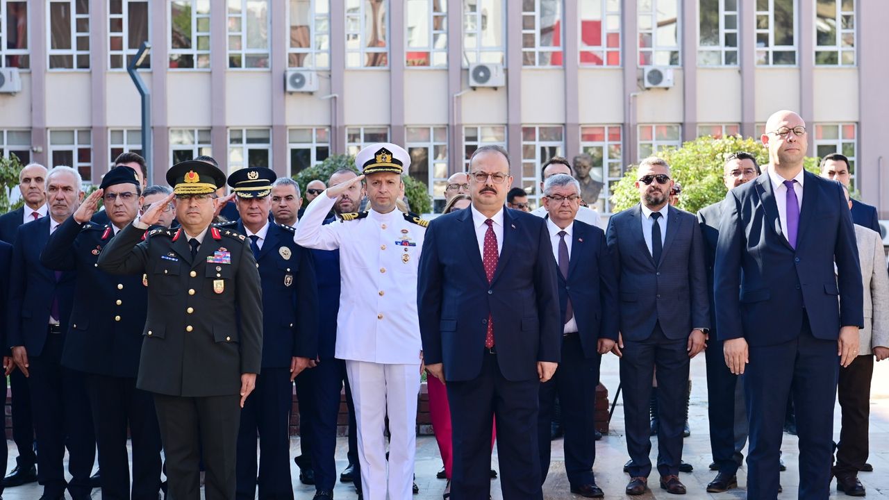 Kutlamaların ilk durağı Valilik önü oldu. Aydın Valiliği, Garnizon Komutanlığı ve Büyükşehir Belediye Başkanlığı temsilcileri Atatürk Anıtı’na çelenk sundu.