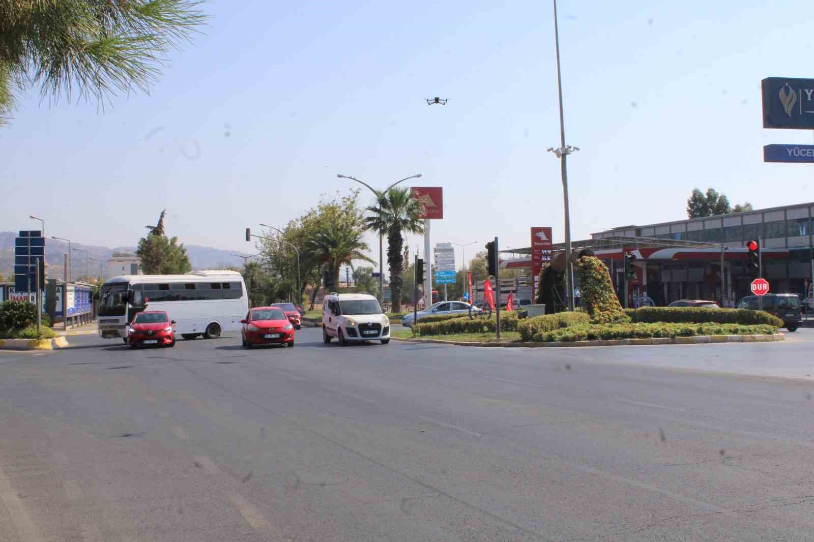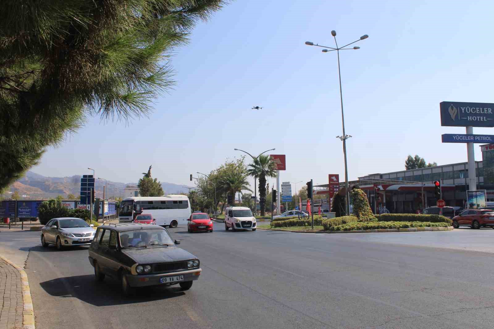 Aydın’da Trafik Denetleme Şube Müdürlüğü ve İnsansız Hava Araçları Büro Amirliği’ne bağlı İHA operatörleri tarafından drone destekli trafik denetimi gerçekleştirildi. Bu çerçevede harekete geçen ekipler Denizli Bulvarı üzerindeki Dr. Raşit Galip Baydur Kavşağı’nda drone destekli denetim gerçekleştirdi. Havadan yapılan denetimlerde, seyir halinde cep telefonu kullanımı, emniyet kemeri takmama, kasksız motosiklet kullanımı ve kırmızı ışıkta geçme konularına ağırlık verilirken, sürücülerin yaptığı ihlaller de havadan görüntülenerek fotoğraflandı.