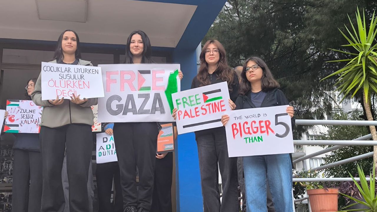 Aydın’ın Efeler ilçesindeki Aydın Lisesi’nde öğrenciler, anlamlı bir etkinliğe imza attı. İsrail’in zulmü altında olan Filistin halkı için Aydın Lisesi öğrencileri, etkinlik düzenledi. Okul bahçesinde gerçekleştirilen etkinlikte öğrenciler, ‘Çocuklar Uyurken Susulur, Ölürken Değil’, ‘Free Palestine’, ‘The World İs Bigger Than’ şeklindeki yazılarla soykırıma ‘dur’ dedi.