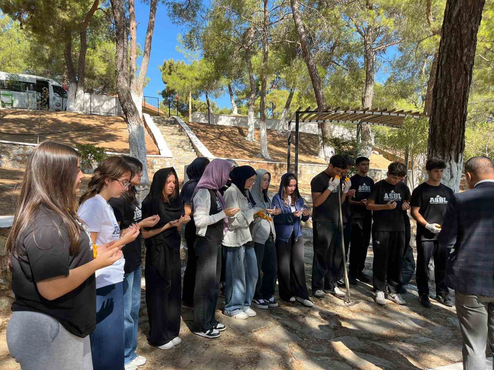 Aydın Sosyal Bilimler Lisesi 11. sınıf öğrencileri, Gözpınar Şehitliği’ni ziyaret ederek hem dua etti hem de şehitlikte çevre temizliği yaptı. Okul Müdürü Fatih Anıl ve felsefe öğretmeni Ahmet Kılıçparlar’ın da katıldığı ziyarette öğrenciler, şehitliğin bakımını üstlenerek duyarlılıklarıyla örnek oldu. Şehitler için edilen duaların ardından gerçekleştirilen temizlik çalışması, gençlerin milli değerlere olan bağlılığını ve vefa duygusunu pekiştirdi.