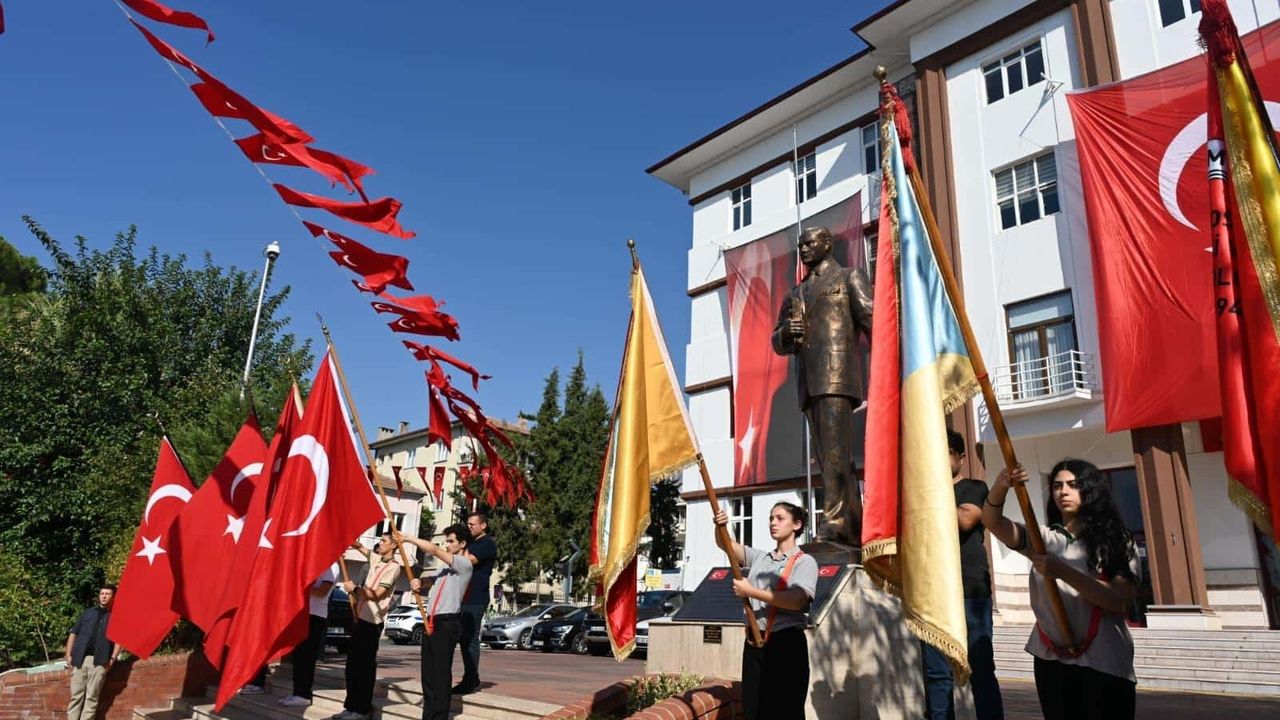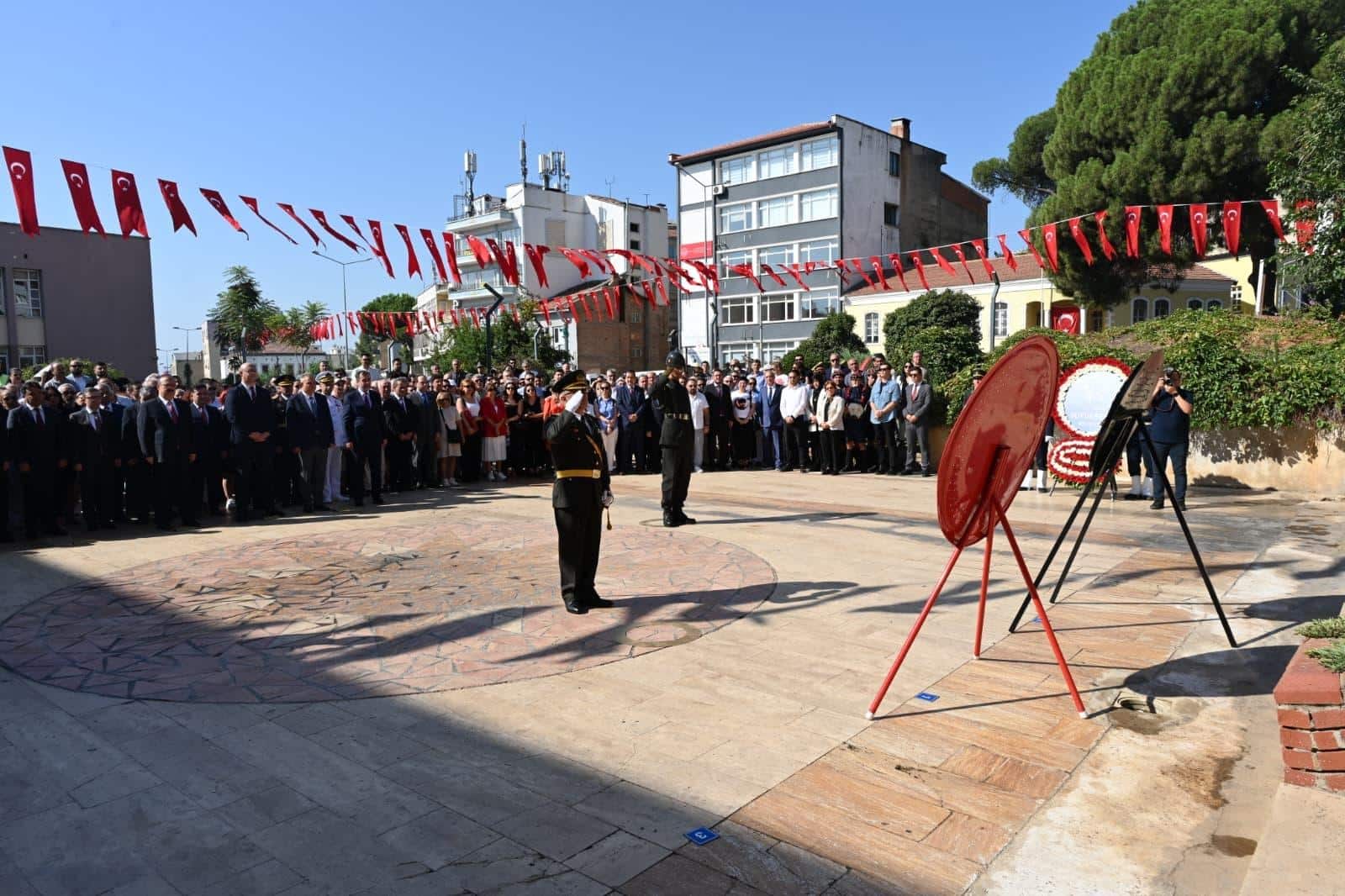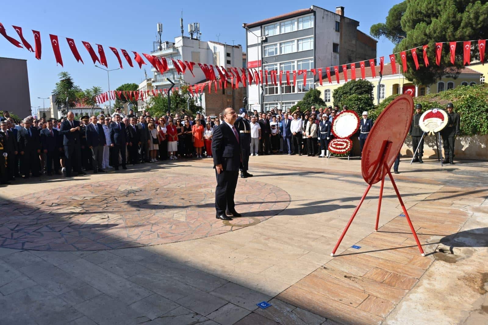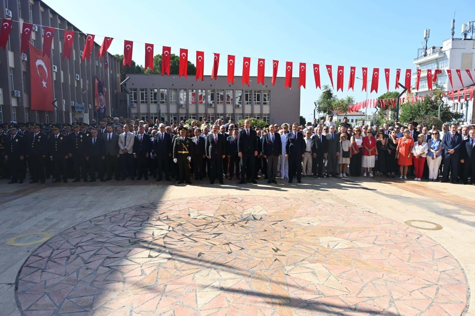 Kutlama programı, Aydın Valiliği önündeki Atatürk Anıtı’na Valilik, Garnizon Komutanlığı ve Büyükşehir Belediyesi çelenklerinin sunulmasıyla başladı. Çelenk sunumunun ardından Saygı Duruşu yapıldı ve İstiklal Marşı okundu. Törende Cumhurbaşkanı Recep Tayyip Erdoğan’ın 30 Ağustos Zafer Bayramı dolayısıyla yayımladığı kutlama mesajı da okundu.