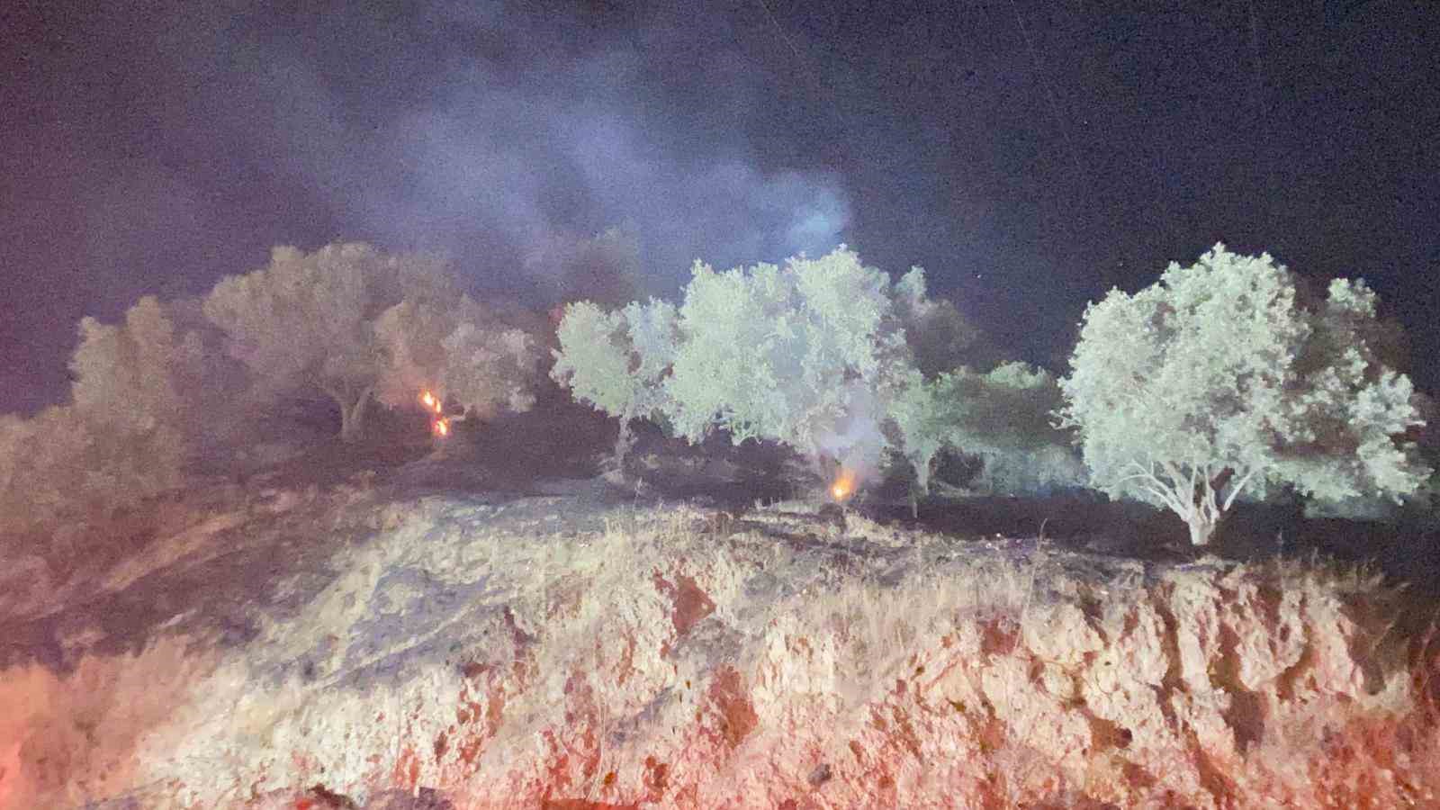 Yangın, Ilıcabaşı Mahallesi’ndeki kum ocağının üst kısmında bulunan zeytinlik alanda henüz bilinmeyen bir nedenle çıktı.