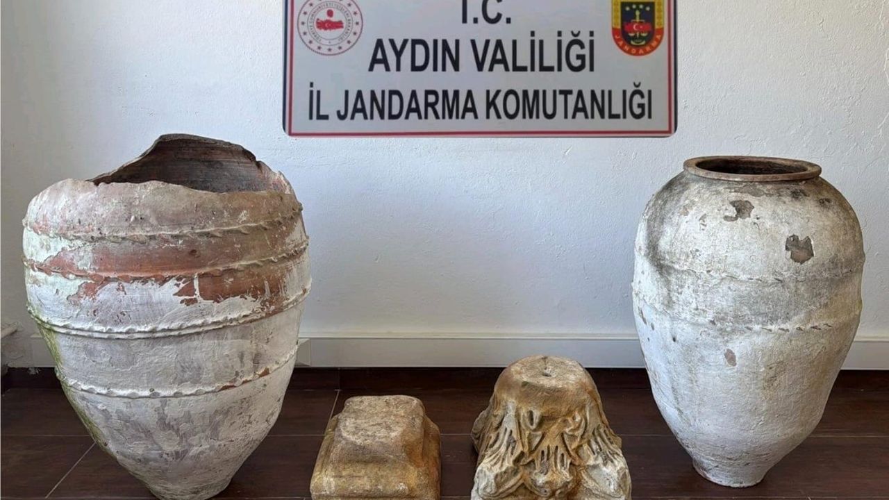 Söke ilçesi Sarıkemer Mahallesi’nde S.B. (41) isimli şahsın ikametinde gerçekleştirilen aramada; 2 adet Roma Dönemine ait Pithos, 1 adet Neolitik Döneme ait Kaide (Plint) Taşı, 1 adet Neolitik Döneme ait Korint Başlığı Taş ele geçirildi.