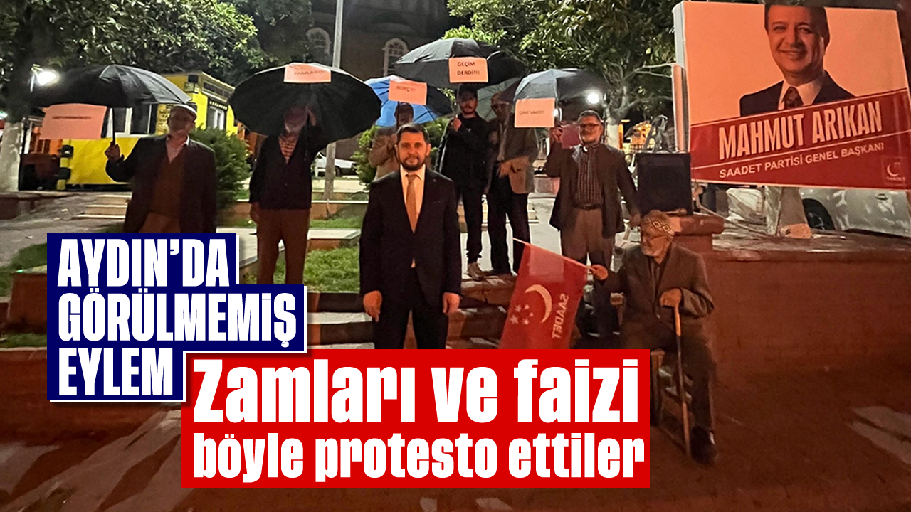 Saadet Partisi Bozdoğan İlçe Başkanı Talha Kayaoğulları'nın basın açıklamasını okuduğu etkinlikte parti üyeleri de üzerinde 'Zamlar, geçim derdi, borç" yazılı şemsiyeleri tuttu.
