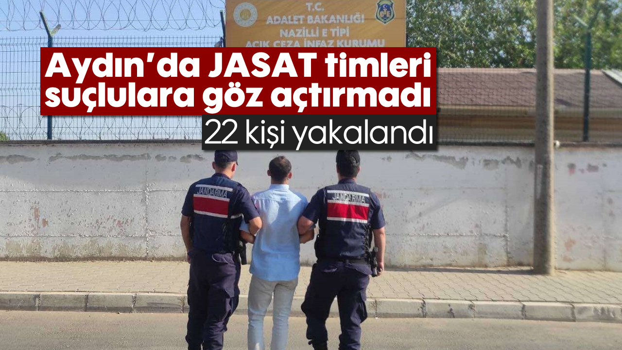 Edinilen bilgiye göre, Aydın İl Jandarma Komutanlığı JASAT timleri ve ilçe jandarma komutanlıklarınca iki gün boyunca yürütülen çalışmalarda 0-5 yıl arası hapis cezası bulunan 9 kişi, 5-10 yıl arası cezası bulunan 1 kişi, 10-20 yıl arası cezası bulunan 5 kişi ve ifadeye yönelik aranan 7 kişi yakalandı. Yakalanan 22 şahıs arasında hırsızlık suçundan 4, narkotik suçlardan 4, yağma suçundan 1, fuhuş suçundan 1, dolandırıcılık suçundan 1 ve çeşitli diğer suçlardan aranan 15 kişinin bulunduğu öğrenildi. Gözaltına alınan şüpheliler hakkında adli işlemlerin sürdüğü bildirildi.