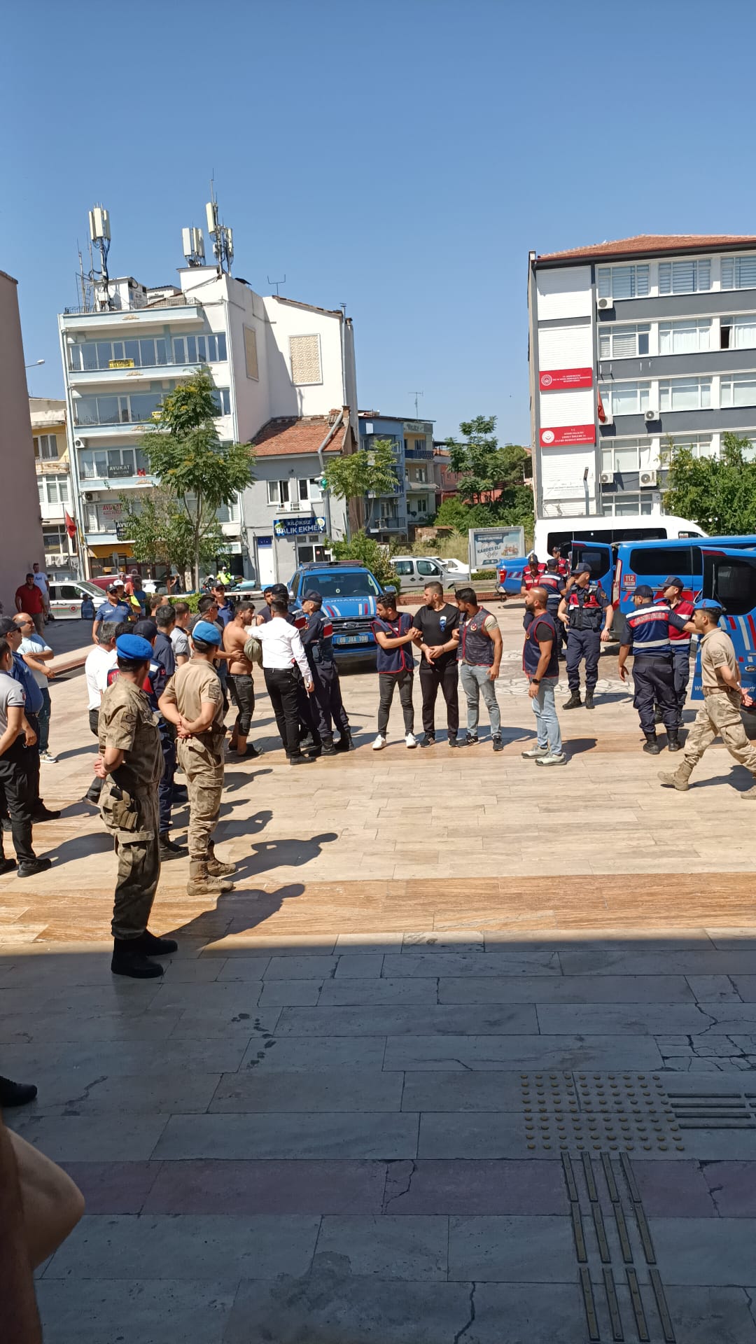 Zanlılar, sabah saatlerinde geniş güvenlik önlemleri altında adliyeye getirildi. Bu sırada bir zanlı yakını tişörtünü çıkartarak elindeki kelepçeyi gizlemesi için zanlıya vermek istedi. Jandarma ekipleri, yakının zanlıya yaklaşmasına izin vermeyince jandarma ekipleriyle zanlıların yakınları arasında kısa süreli arbede yaşandı. Jandarma ve Çevik kuvvet ekiplerinin de müdahalesiyle kalabalık adliyenin dışına çıkartıldı.