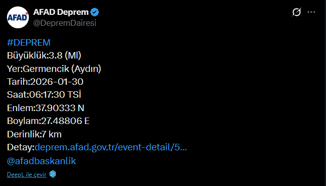 Saat 06.17’de kaydedilen depremin yerin 7 kilometre derinliğinde meydana geldiği bildirildi. Sığ derinliği nedeniyle deprem, Germencik başta olmak üzere Aydın merkez ve çevre ilçelerde kısa süreli olarak hissedildi. Sabah saatlerinde yaşanan sarsıntı, bazı vatandaşların uykudan uyanmasına neden olurken, özellikle yüksek katlı binalarda hissedilme düzeyinin daha belirgin olduğu ifade edildi.