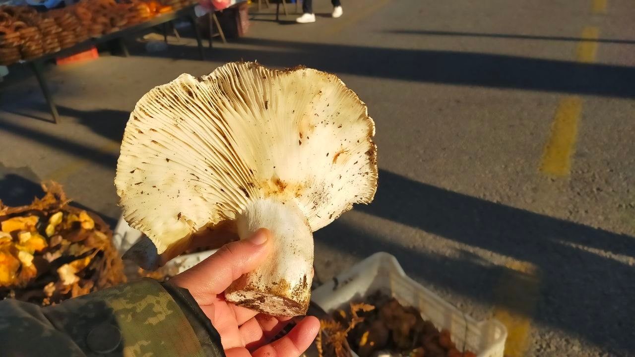 Tezgahtaki iri mantarlar pazara gelen vatandaşların yoğun ilgisini çekerken, birçok kişi mantarların büyüklüğünü cep telefonlarıyla görüntüledi.