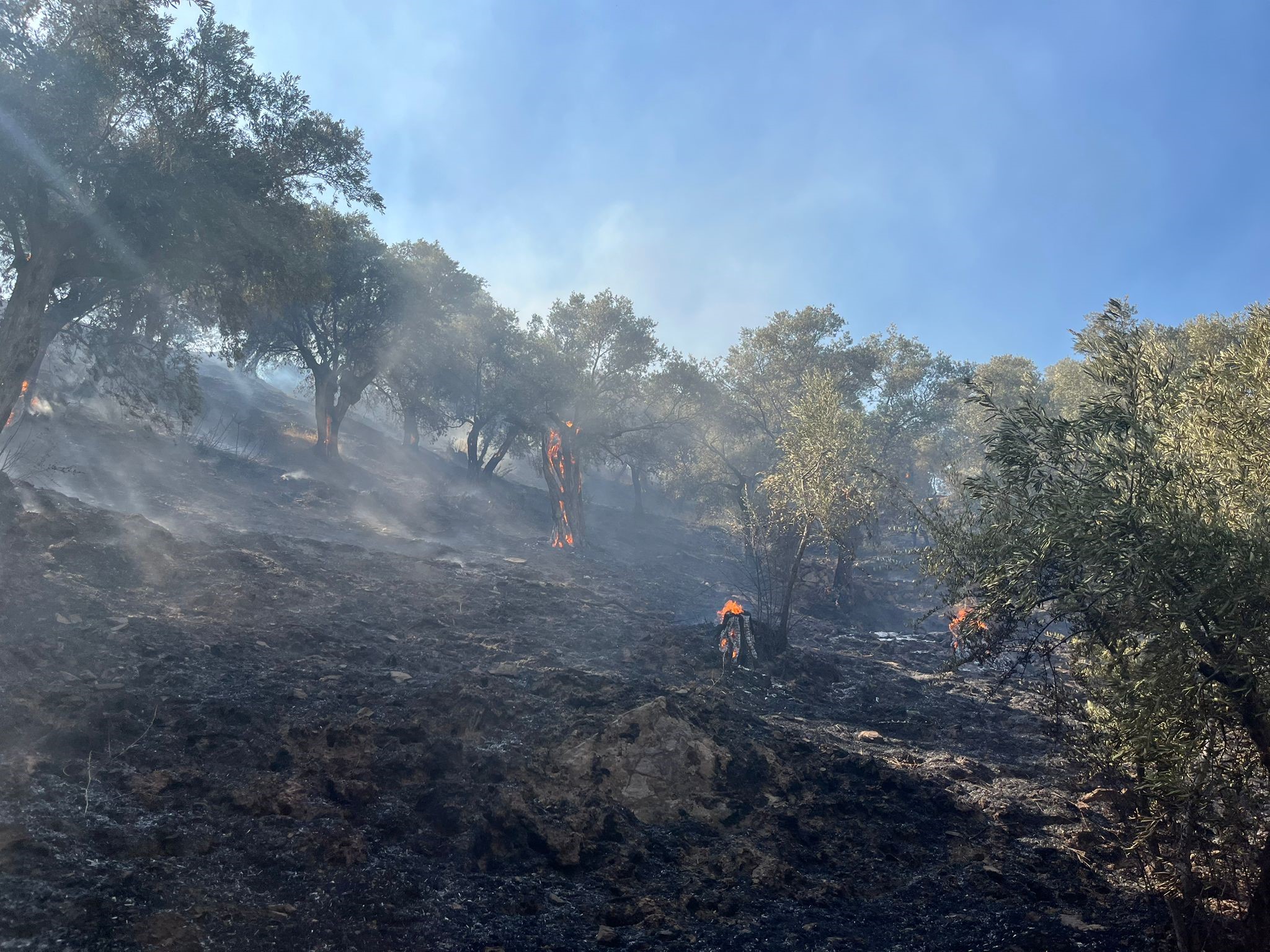 Rüzgarın etkisiyle büyüyen yangın söndürmek için ekipler, alevlere hem havadan hem karadan müdahale etti. Ekiplerin yoğun gayreti sonucunda yangın, kontrol altına alındı. Yangında 30 dönüm zeytinlik alanın zarar gördüğü öğrenildi. Trafo kaynaklı çıktığı tahmin edilen yangınla ilgili soruşturma başlatıldı.