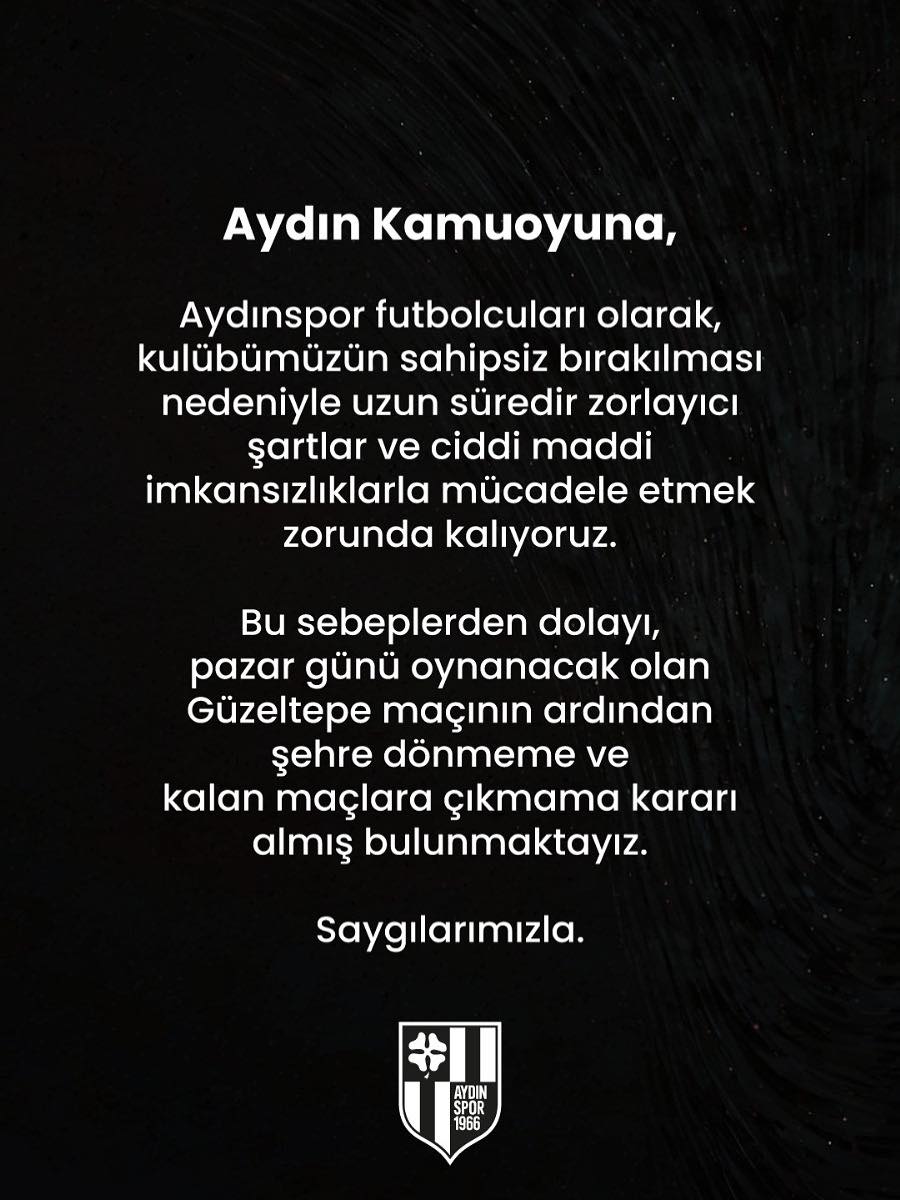 Aydınspor futbolcuları, kulübün sahipsiz bırakıldığını belirterek uzun süredir maddi imkânsızlıklarla mücadele ettiklerini açıkladı. Siyah beyazlı takımın oyuncuları, Güzeltepe maçından sonra şehre dönmeyeceklerini ve kalan maçlara çıkmayacaklarını duyurdu.