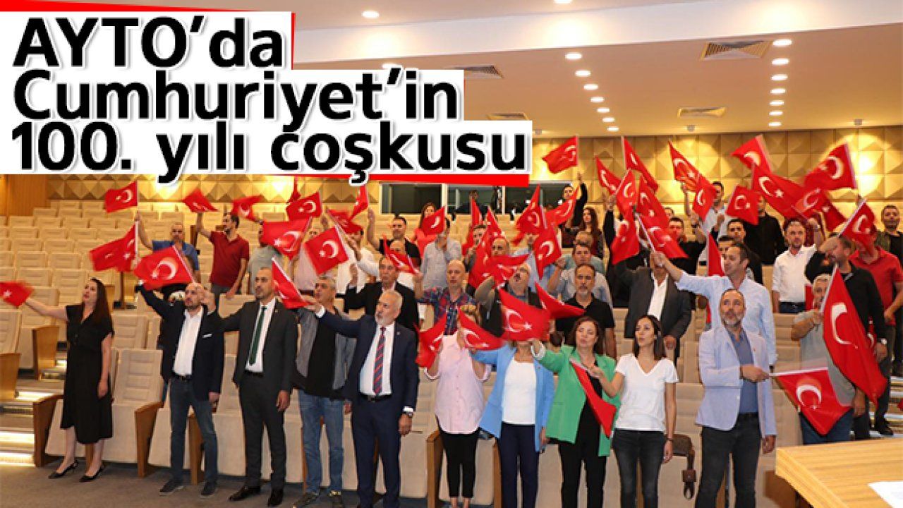 29 Ekim Cumhuriyet Bayramı ve Cumhuriyetin 100.yılı dolayısıyla gerçekleştirdiği konuşmasında TOBB Yönetim Kurulu Üyesi ve AYTO Başkanı Hakan Ülken, “Bugün özel bir gün, bugün 29 Ekim’e 2 gün kala Ekim ayı son Cuma’sında bir araya gelerek Ekim Ayı Meclis Toplantımızı gerçekleştiriyoruz. Cumhuriyetimizin 100.yılının kutlanacağı hafta bu hafta, 16 tane devlet kurmuş bir milletin, yıkılmış yeniden ayağa kalkmış, her türlü tarih çerçevesinde, tarihin içerisinde tüm haksızlıklara uğramış bir milletin fertleriyiz. Devletlerimiz yıkılmış, tekrar kurmuşuz, Ergenokon’a hapsedilmişiz, demir dağları eritmişiz, Buminkağan, İslemihan dönmüş Batı ve Doğu Göktürkleri kurmuş, daha sonrasında Gazneliler,840’ta Karahanlılar döneminde İslamiyeti kabul etmişiz, ardından İslamın kılıcı olmuşuz. Viyana’ya ulaşmışız, dünyaya medeniyet ulaştırmış, dünyaya insanlık öğretmişiz, hiçbir yerde asimilasyon yapmayarak hiç kimsenin diline, dinine karışmamışız. Anadolu’ya hapsolmuşuz ve bir gözlü mavi gözlü dev çıkmış. O mavi gözlü dev ile birlikte bir millet uyanmış, o milletin içinde Aydın’dan Efeler olmuş, Trabzon’dan kızanlar olmuş, Diyarbakır’dan, Mardinden, Urfa’dan, Edirne’den, Şam’dan, Halep’ten aklınıza gelen tüm Osmanlı coğrafyasından Atalarımız olmuş ve biz bir harman olmuşuz. Bunun adına vatandaşlık bağı ile bağlı Türk milleti denmiş anayasada. Bu millete sevgi bağı ile bağlanan her kim varsa bu Cumhuriyeti beraber kurmuş, beraber harmanlamış ve bugüne kadar getirmişiz. Bugün bu anı kutlama zamanı. Nice 100 yıllara, nice onurlu, başı dik, hür, bağımsız yıllara.” dedi.