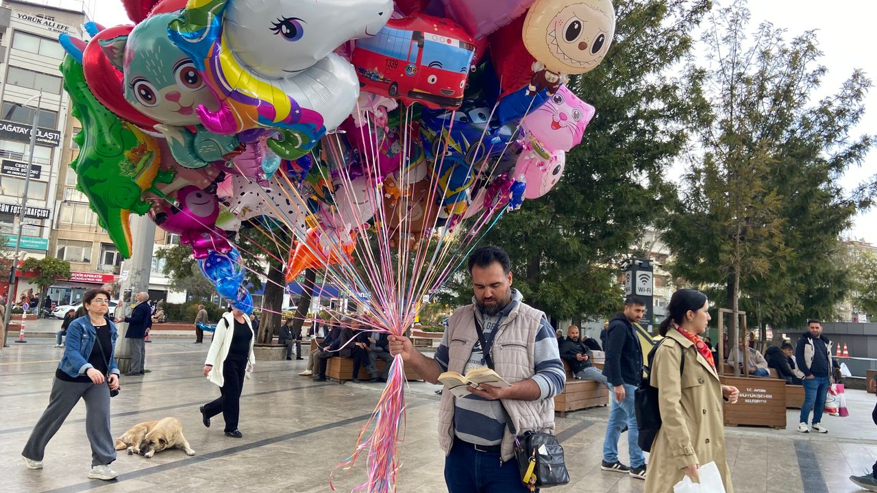 Aydın’ın Efeler ilçesinde bulunan Atatürk Kent Meydanı’nda balon satarak yaşamını sürdüren Dursun Öztürk, kitaplara olan ilgisiyle dikkat çekiyor. Ortaokuldan sonra çalışma hayatına atılan Öztürk, yıllardır edindiği okuma alışkanlığını hiç bırakmadı. Günün büyük bölümünü meydanda geçiren Öztürk, balon satışı yaparken dahi kitap okumaya devam ediyor.