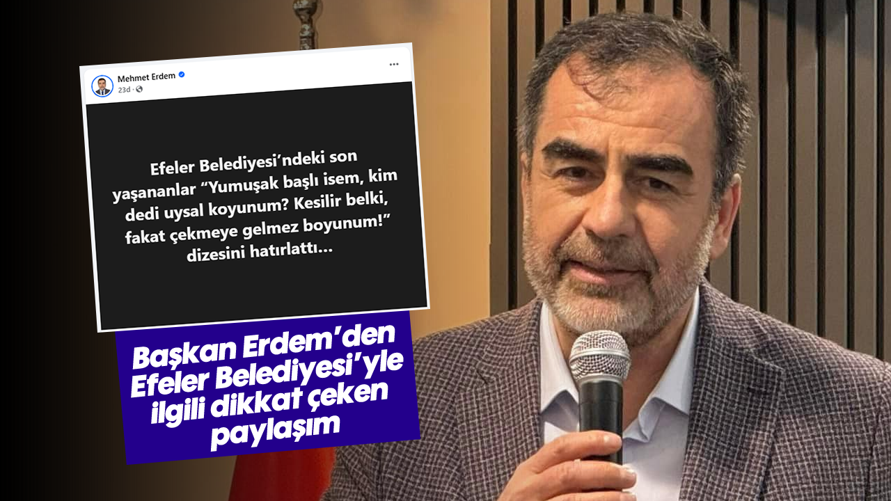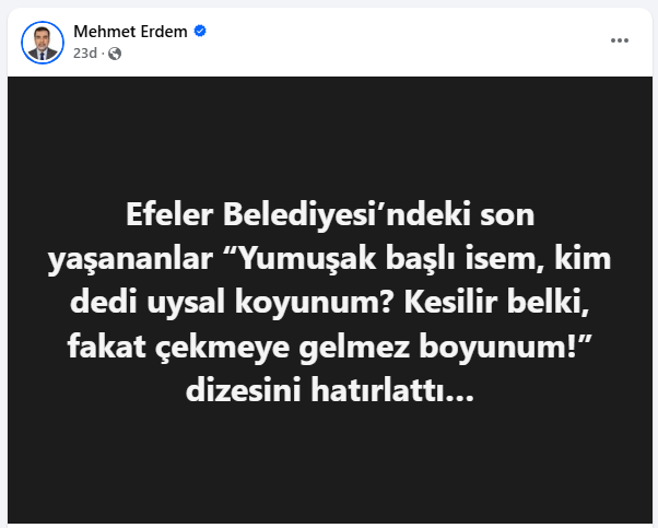 Belediyede yaşanan bu gelişmelerin ardından, AK Parti Aydın İl Başkanı Mehmet Erdem, sosyal medya hesabından dikkat çeken bir paylaşımda bulundu. Erdem, paylaşımında İstiklal Marşı’nın şairi Mehmet Akif Ersoy’un “Zulmü Alkışlayamam” şiirinden bir dizeye yer verdi. Erdem paylaşımında, “Efeler Belediyesi’ndeki son yaşananlar “Yumuşak başlı isem, kim dedi uysal koyunum? Kesilir belki, fakat çekmeye gelmez boyunum!” dizesini hatırlattı” ifadelerini kullandı.