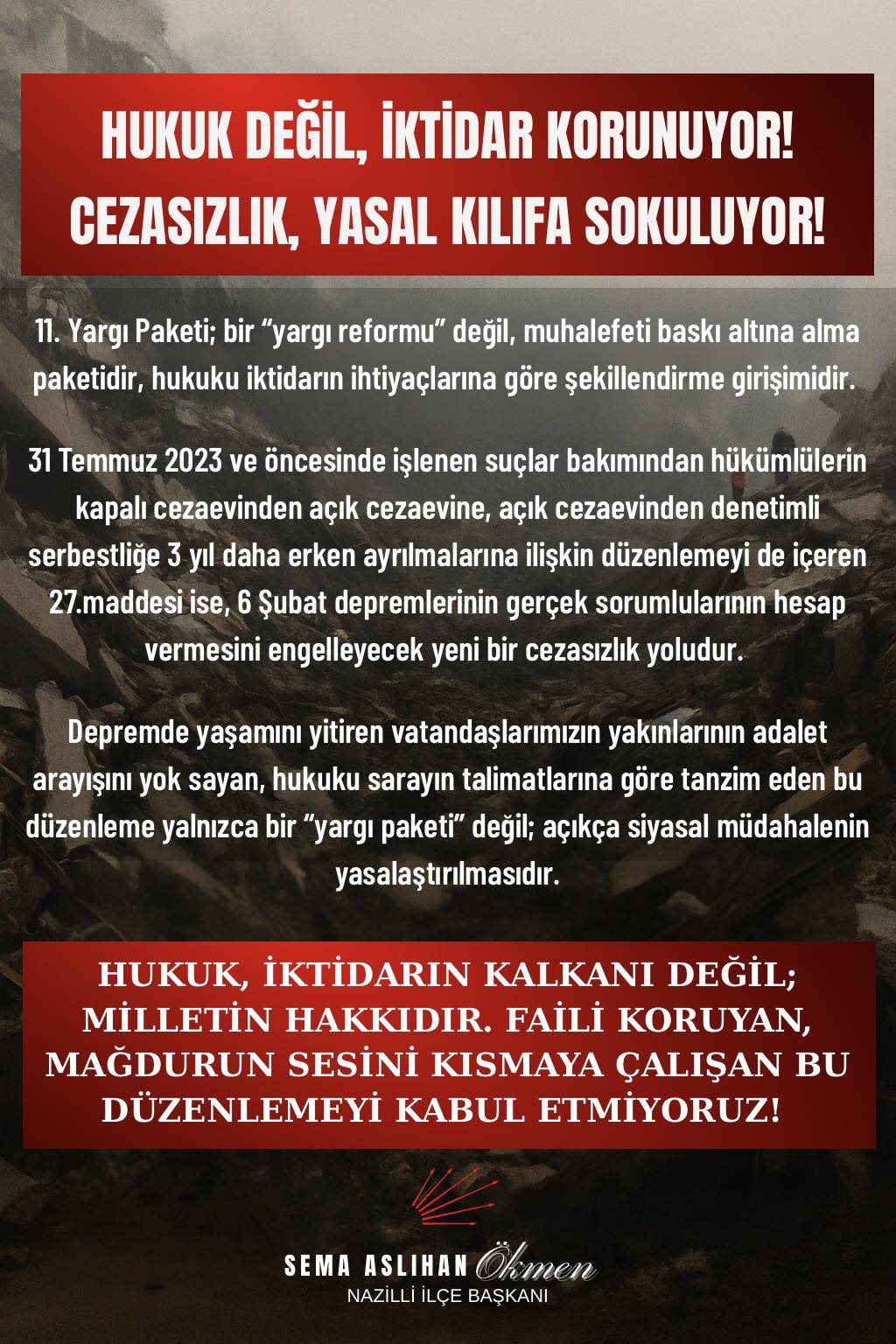 CHP Nazilli İlçe Başkanı Avukat Aslıhan Ökmen, TBMM Adalet Komisyonu’ndan geçen 11. Yargı Paketi’ne sert tepki gösterdi. Düzenlemenin özellikle depremde sorumluluğu bulunan kişileri koruyan hükümler içerdiğini savunan Ökmen, teklifin “adalet arayışını zedelediğini” söyledi.