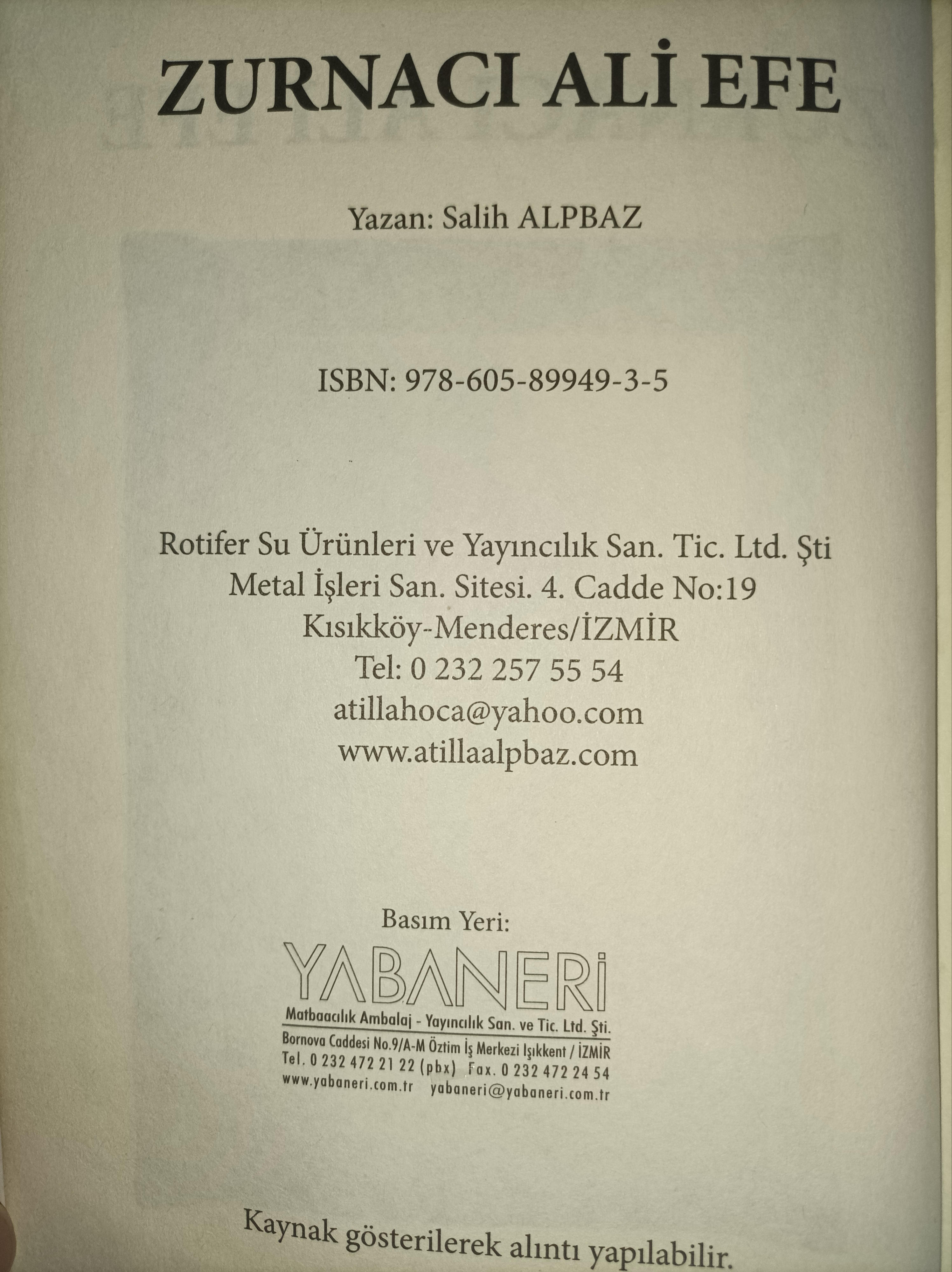 Bu notlar, bizzat Zurnacı Ali Efe'nin kendi ağzından anlatımı ve babamın daktilo ile yazarak tutmuş olduğu gerçek bir hayat hikayesidir. Babamızın Zurnacı Ali Efe notlarını bir kitap ve Karacasu Efeler tarihine ışık tutacak bir belge olarak, geç de olsa yayınlamayı bir görev bildik. Notları kitap halinde yayımlarken babamız tarafından yazılanlara sadık kalmaya çalıştık. Hiçbir değişikliğe uğratmadık. Böylece Zurnacı Ali Efe'nin bizzat anlatımı ile yazılan bu hikaye umarız Aydın Karacasulu hemşehrilerimizin ve Ege efelik tarihine ilgi duyanların ilgisini çekecektir."