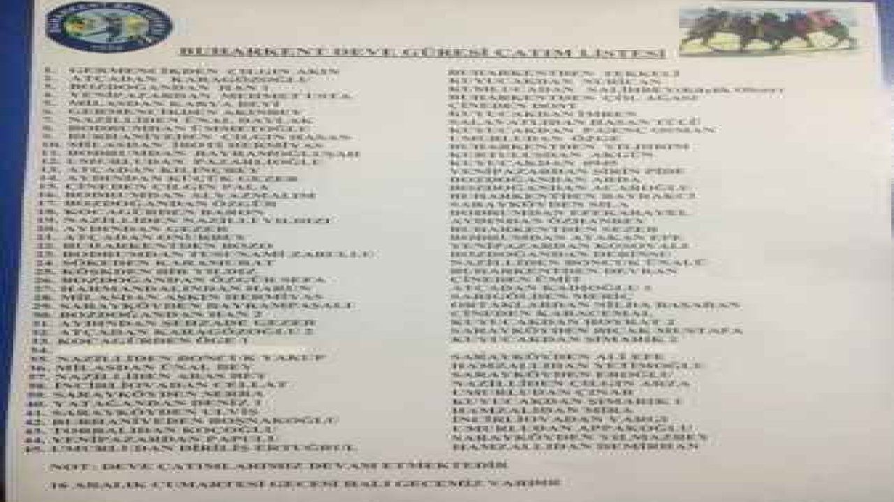 Bu yıl birbirinden ünlü develer, iki yıl önce Buharkent'e kazandırılan, Türkiye'nin en büyük deve güreşi sahası olarak bilinen arenada güreşecek. Germencik'ten Çılgın Akın, Buharkent'ten Tekkeli, Bodrum'dan Alyazmalım, Nazilli'den Aras Be, Bozdoğan'dan Özgür gibi merakla beklenen isimlerin yer aldığı 88 develik çatım listesi belli oldu. 17 Aralık Pazar günü düzenlenecek Deve Güreşi Festivali'nin bir gün öncesinde, deve sahiplerinin müzikle eğleneceği halı gecesinin yapılacağı da bildirildi.