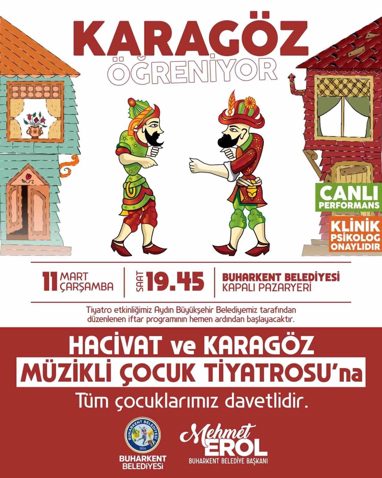 Aydın’ın Buharkent ilçesinde çocuklar için kültürel bir etkinlik düzenlenecek. Buharkent Belediyesi işbirliğiyle Aydın Büyükşehir Belediyesi tarafından Kapalı Pazaryeri’nde gerçekleştirilecek iftar programının ardından çocuklara yönelik "Hacivat ve Karagöz Müzikli Çocuk Tiyatrosu" etkinliği düzenleyecek. Buharkent Belediye Başkanı Mehmet Erol, sosyal medya hesabından yaptığı paylaşımda tüm vatandaşları etkinliğe davet etti.