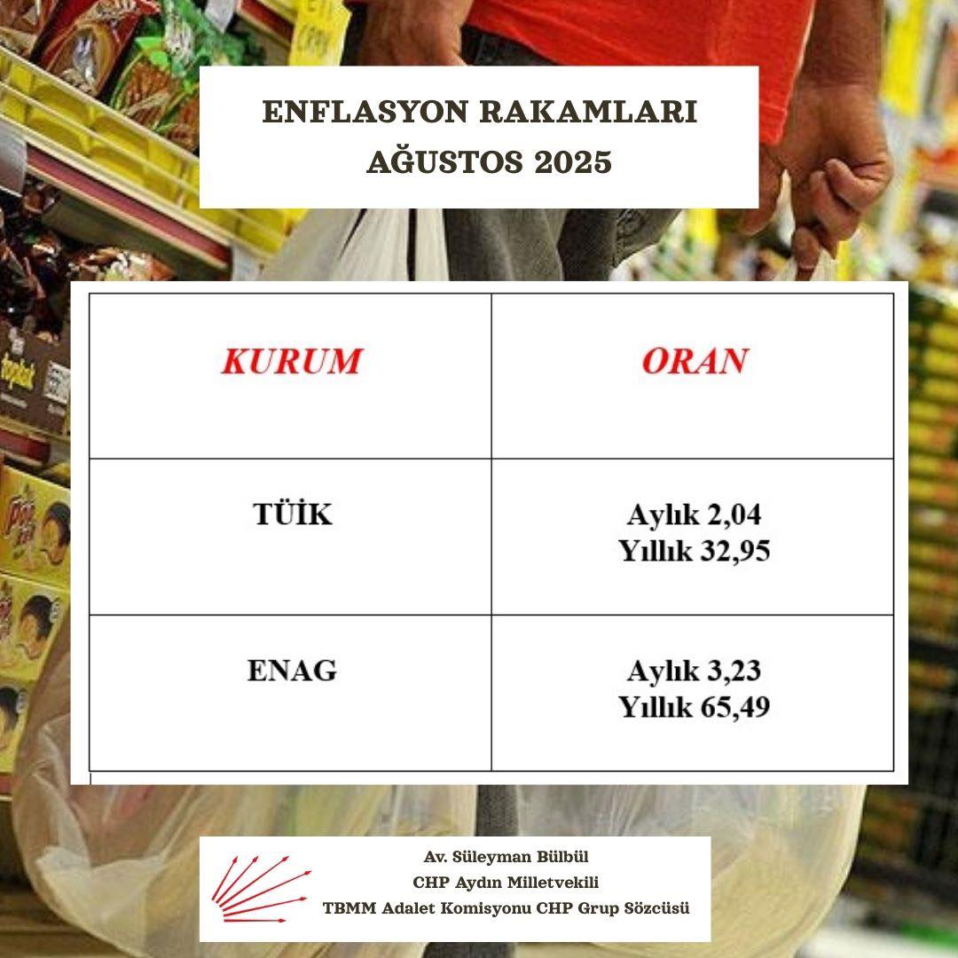 TÜİK tarafından Ağustos 2025 enflasyonu yüzde 32,95 olarak açıklandı. Bu rakama tepki gösteren Bülbül, sosyal medya ve yaptığı açıklamada şunları ifade etti: “TÜİK’e göre enflasyon yüzde 32,95, ENAG’a göre yüzde 65,49. Kira artış oranı yüzde 32,95. Gıda fiyatları uçuyor, TÜİK ise madde fiyat listesini gizliyor. Memur ve emeklilere şimdilik yüzde 10,09 zam görünüyor. Geniş tanımlı işsiz sayısı 12 milyon 30 bine dayandı. Açlık sınırı 27 bin 111 TL, yoksulluk sınırı 88 bin 310 TL. Resmi enflasyon ile vatandaşın yaşadığı hayat pahalılığı arasında dağlar kadar fark var. TÜİK eliyle emeklinin ve memurun maaşından çalınıyor.”