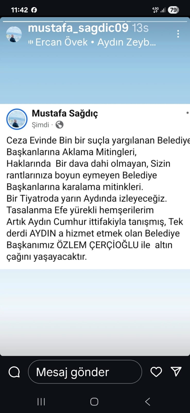 Cumhur ittifakı ortağı MHP’nin Didim İlçe Başkanı Mustafa Sağdıç sosyal medya hesabından yaptığı paylaşımda Çerçioğlu’na destek verdi.