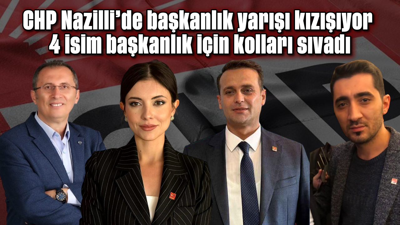 Cumhuriyet Halk Partisi (CHP) Nazilli İlçe Örgütü’nde kurultay süreciyle birlikte başkanlık yarışı da resmen başlamış oldu. Mevcut Başkan Sema Aslıhan Ökmen’in yeniden aday olacağı öğrenilirken, kulislerde Erkan Acahan, Selçuk Ağca ve Ekrem Eskici isimleri de öne çıkıyor.