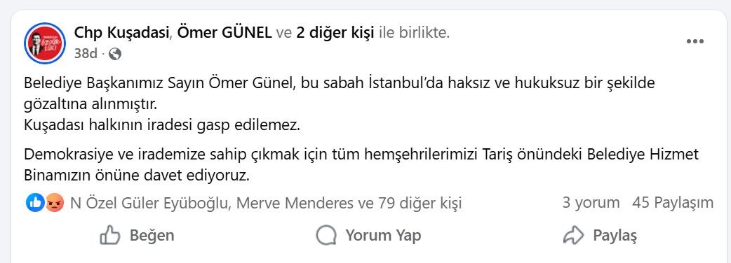 Cumhuriyet Halk Partisi Kuşadası İlçe Başkanlığı, Kuşadası Belediye Başkanı Ömer Günel’in gözaltına alınmasının ardından sosyal medya üzerinden vatandaşlara çağrıda bulundu. Kuşadası’nda yapılan paylaşımda, belediye başkanına yönelik gözaltı işleminin “haksız ve hukuksuz” olduğu savunularak vatandaşların belediye binası önünde toplanması istendi.