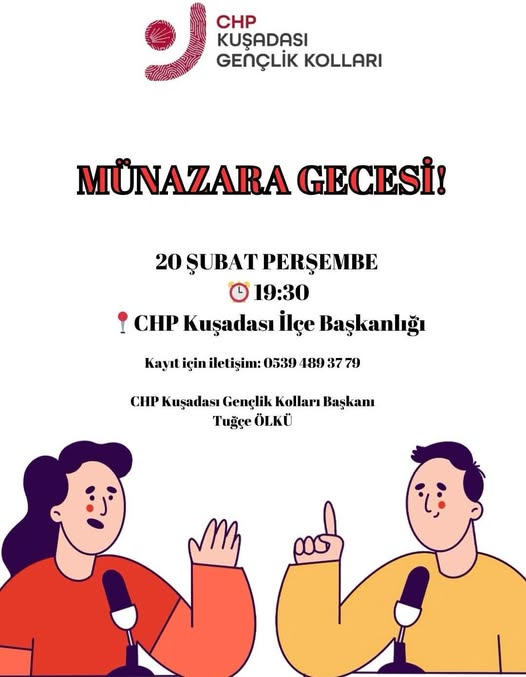 CHP Kuşadası İlçe Gençlik Kolları Başkanı Tuğçe Ölkü'nün moderatörlüğünde düzenlenecek olan 'Münazara Gecesi'nde, gençler, düşüncelerini özgürce ortaya koyabilecekleri farklı fikirler ışığında beyin fırtınası yaşayacak. ''Çalışma hayatında kadınlara pozitif ayrımcılık sağlanmalı mı,sağlanmamalı mı?'' teması ile gerçekleşecek olan etkinlik, 20 Şubat Perşembe günü saat 19:30’da CHP ilçe teşkilat binasında gerçekleşecek. Etkinliğe dahil olmak isteyen gençlerin, Gençlik Kolları Başkanı Ölkü'ye ya da CHP Sanat Etkinlikleri Sorumlu Başkan Yardımcısı Filiz Hız ile iletişime geçmeleri istendi.
