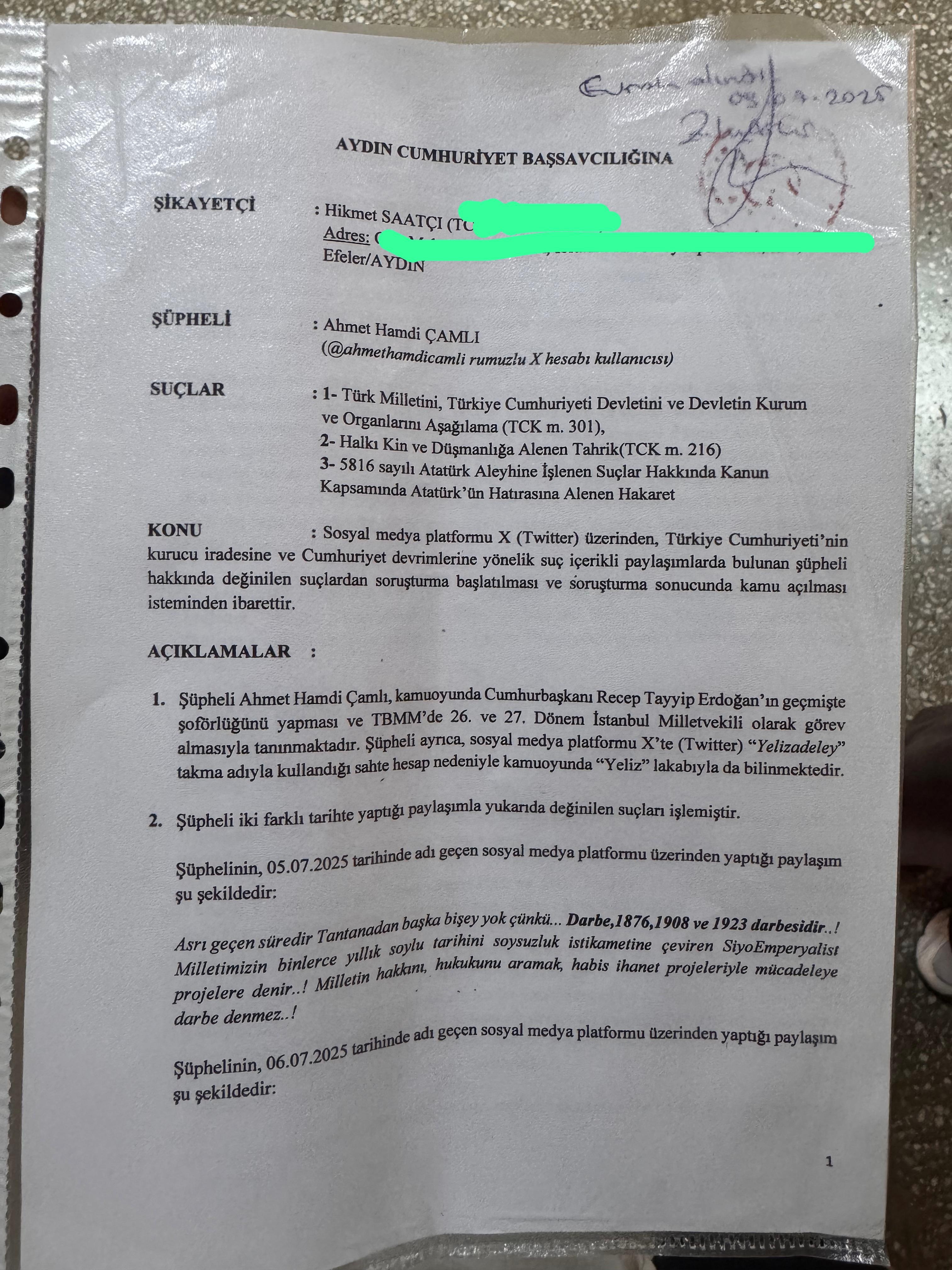 “Türkiye Cumhuriyeti’ne ve cumhuriyetimizin kurucusu Gazi Mustafa Kemal Atatürk’e hakaret eden; kamuoyunda “Yeliz” lakabıyla bilinen AKP önceki dönem Milletvekili Ahmet Hamdi Çamlı hakkında Aydın Cumhuriyet Başsavcılığı’na suç duyurusunda bulunduk. Bu şaşkın kişinin şanlı tarihimize, bağımsızlık mücadelemize atıfta bulunarak cumhuriyetimize kanlı darbe benzetmesi yapması iğrençliktir. “Ben ne dersem doğrudur” zihniyetini kendine şiar ederek memleket yönetmeye çalışan bu anlayışın, halk iradesini ve cumhuriyetimizi aşağılayan ifadeleri, artık yalnızca bir söylem değil, açık bir nefret suçu ve provokasyondur. Cumhuriyet Savcılarımızın gereğini yapacaklarını temenni ediyor, ilgili şahsın hak ettiği cezayı alması için takipte olacağımızı belirtiyorum.”