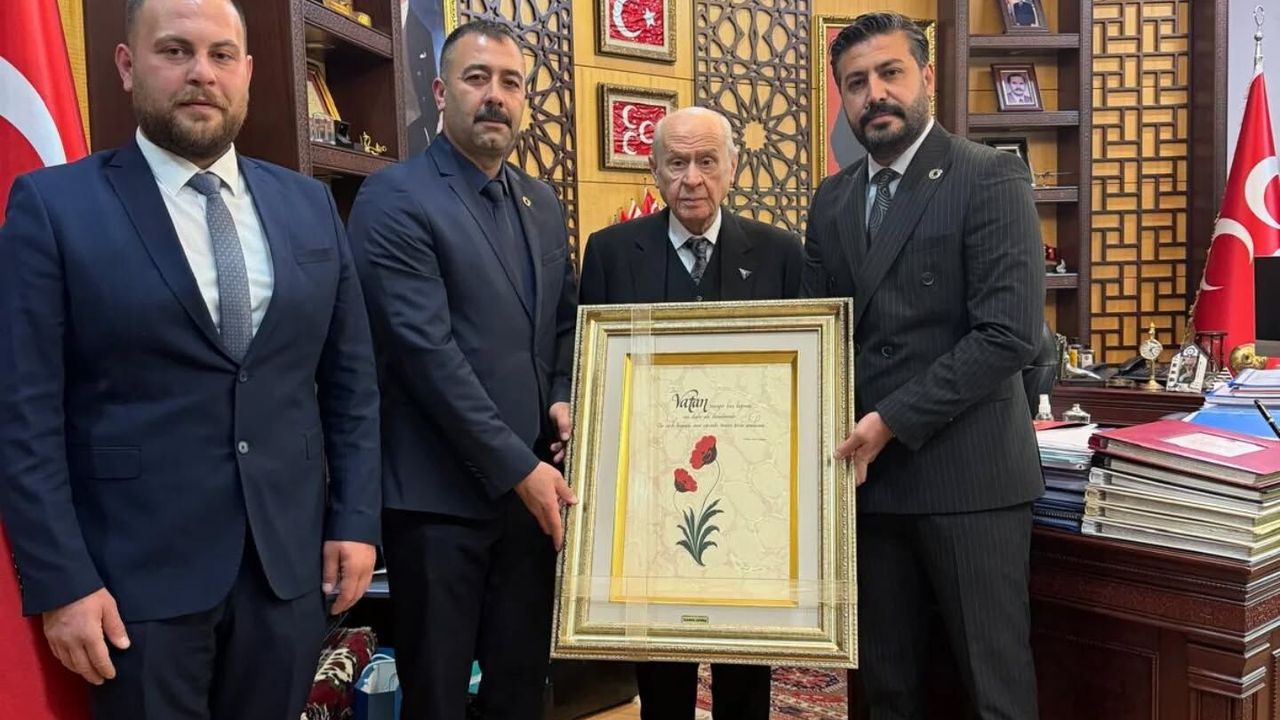 MHP Aydın İl Başkanı Osmangazi Cihangiroğlu, Ankara’ya giderek MHP Genel Başkanı Devlet Bahçeli’yle bir araya geldi. MHP Genel Merkezi’ndeki ziyarette Cihangiroğlu’na Ülkü Ocakları Aydın eski İl Başkanı Tayfun Şan ve Ömer Çakır da eşlik etti. Ziyarette Cihangiroğlu ve beraberindeki heyet, Bahçeli’ye vatan temalı hat sanatından oluşan tablo hediye etti.
