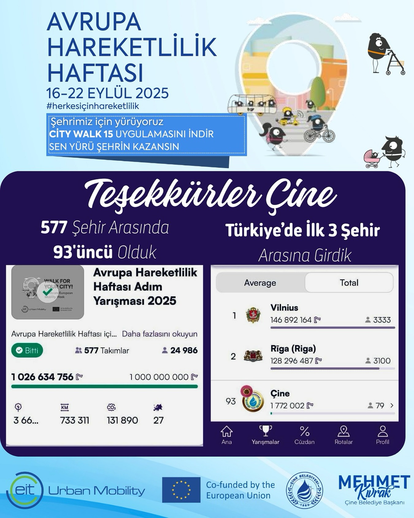 Çinelileri tebrik eden Çine Belediye Başkanı Mehmet Kıvrak, “Avrupa Hareketlilik Haftası kapsamında Çine Belediyesi olarak ‘Walk15’ adım mücadelesine katıldık. 19-22 Eylül 2025 tarihleri arasında 79 hemşehrimizle birlikte 1 milyon 707 bin 72 adım attık. Bin 266 kilometre yol kat ettik. 228 kilogram karbondioksit tasarrufu sağladık. 6 bin 329 ağacı kurtardık. Bu mücadelede, 577 şehir arasında 93’üncü sırada, Türkiye’de ise ilk 3 şehir arasında Eskişehir, Çorlu, Çine olarak yer almanın gururunu yaşıyoruz. Hem şehrimiz hem de dünyamız için katkı sunan tüm hemşehrilerimize teşekkür ederiz. Unutmayalım: Sokaklar arabalar için değil, yayalar içindir.” diye konuştu.