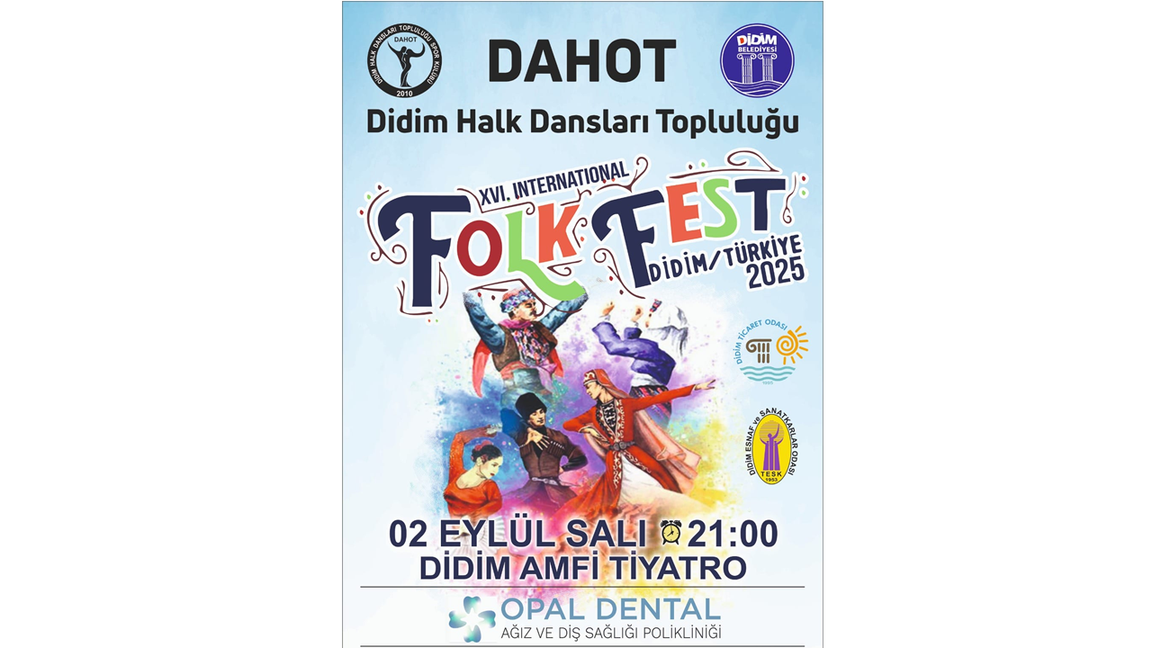 Didim Belediyesi, Didim Ticaret Odası ve Didim Esnaf ve Sanatkarlar Odasının yanı sıra özel sponsorlarında destek olduğu DAHOT’un Halk Danslar festivalinin tarihi belli oldu. Bu yıl 16. düzenlenecek olan Didim Uluslararası Halk Dansları Festivali 2 Eylül Salı günü saat 21:00’de Didim Amfi tiyatroda gerçekleştirilecek. Ülkemizin değişik yörelerinden halk oyunları ekiplerinin yanı sıra yurt dışında da davet edilen bir çok topluluk halk oyunlarını sergileyecek.