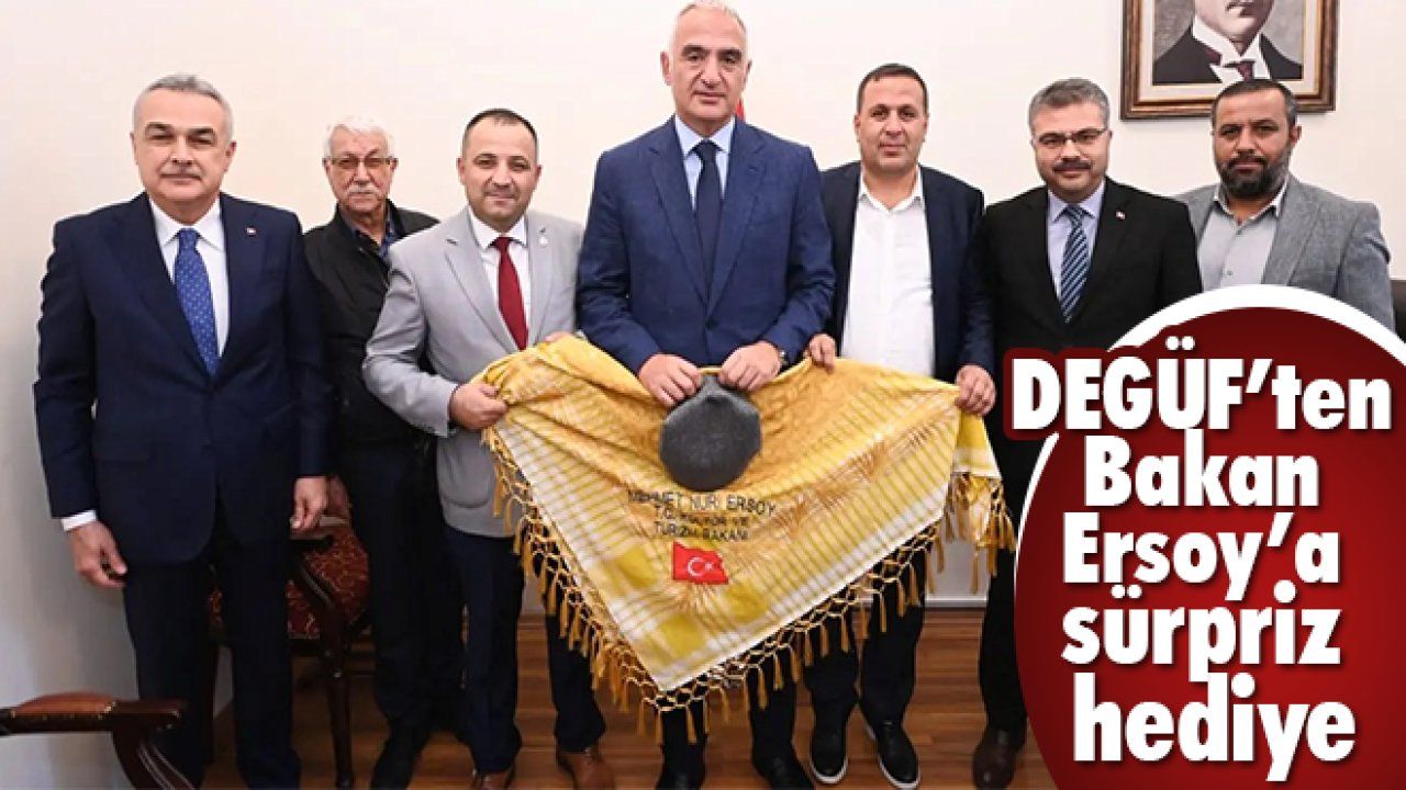 Bakan Ersoy’a ziyaret sonundan DEGÜF tarafından poşu ve sekiz köşe kasket hediye edildi. Bakan Ersoy, sekiz köşe kasket ve poşu ile birlikte Aydın heyeti ile objektiflere poz verdi.