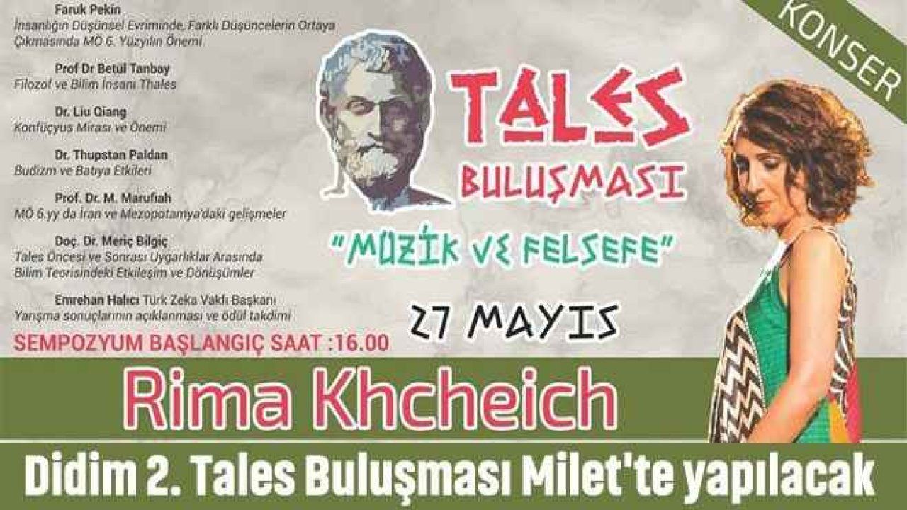 Didim Belediyesi, Didim Turizm Altyapı Hizmet Birliği (DİTAB), Turizm Araştırmaları Derneği (TURAD) ile Didim Turizm Derneğinin destekleriyle ve Kültür ve Turizm Bakanlığının katkılarıyla yapılan Tales festivalin ikincisi 27 Mayıs Cumartesi günü Milet Antik kentinde yapılacak. Bu yıl Tales buluşmasının konusu, “M.Ö. 6 yy - “Aydınlanma Çağında Tales ve Çağdaşları ” olacak. CAZ KONSERİ YER ALACAK Bu yıl ikincisini düzenlenecek etkinlikte; Türk bilim insanlarının yanında, İran, Çin ve Hindistan’dan gelecek felsefeciler, Tales ve çağdaşlarının modern felsefenin farklı topraklarda doğuşu üzerindeki etkilerini ve aralarındaki etkileşimi anlatacaklar. Programda, 27 Mayıs Cumartesi günü, Milet Antik Tiyatroda 2500 yıl öncesinin ortamında düzenlenecek sempozyum; bir müzik dinletisi ile tamamlanacak. Yüzyıllar önce, ataları Anadolu’ya Fenike’den göç eden Tales’in anayurdundan, önemli bir ses; Arapça caz solisti (akustik) Rima Khceich bir konser verecek. Ayrıca Tales Buluşması kapsamında, Türk Zeka Vakfı da yarışma düzenyecek. Gençlere ve yetişkinlere yönelik 4 soruluk bu yarışmada kazananlara; İzmir Uzay Kampı ve Nesin Vakfı Matematik Kampı kurslarına katılım ödülü verilecek. PROGRAMDA NELER VAR 27 Mayıs günü saat 16:00’da Tales’in yaşadığı yer alan Balat Mahallesindeki Milet antik kentinde yapılacak olan buluşmada açılış konuşmalarının ardından sempozyuma geçilecek. Sempozyumda programı şu şekilde; 16:00 :Milet’te programın açılış konuşmaları 17:00 :Sempozyum Faruk Pekin “İnsanlığın Düşünsel Evriminde, Farklı Düşüncelerin Ortaya Çıkmasında MÖ 6. Yüzyılın Önemi” Prof Dr Betül Tanbay “Filozof ve Bilim İnsanı Thales” Dr. Liu Qiang “Konfüçyus Mirası ve Önemi” Dr. Thupstan Paldan “Budizm ve Batıya Etkileri” Prof. Dr. M. Marufiah “Zerdüşt Felsefesi” Doç. Dr. Meriç Bilgiç “Tales Öncesi ve Sonrası Uygarlıklar Arasında Bilim Teorisindeki Etkileşim ve Dönüşümler” 18:30 :Emrehan Halıcı Türk Zeka Vakfı Başkanı Yarışma sonuçlarının açıklanması ve ödül takdimi 19:00 :Rima Khcheich Konser