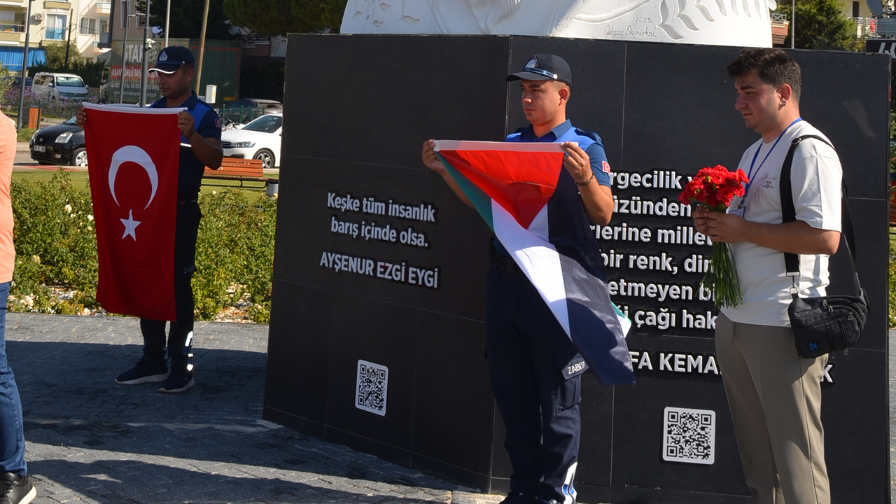 Ayşenur Ezgi Eygi parkındaki çelenk koyma töreni öncesinde heykelin her iki yanında Türkiye ve Filistin bayrakları yer alırken, Başkan Gençay üzerinde barışın simgesi beyaz güvercinin yer aldığı çelengi iki gençle birlikte heykele bıraktı; ardından heykele kırmızı karanfiller konuldu.