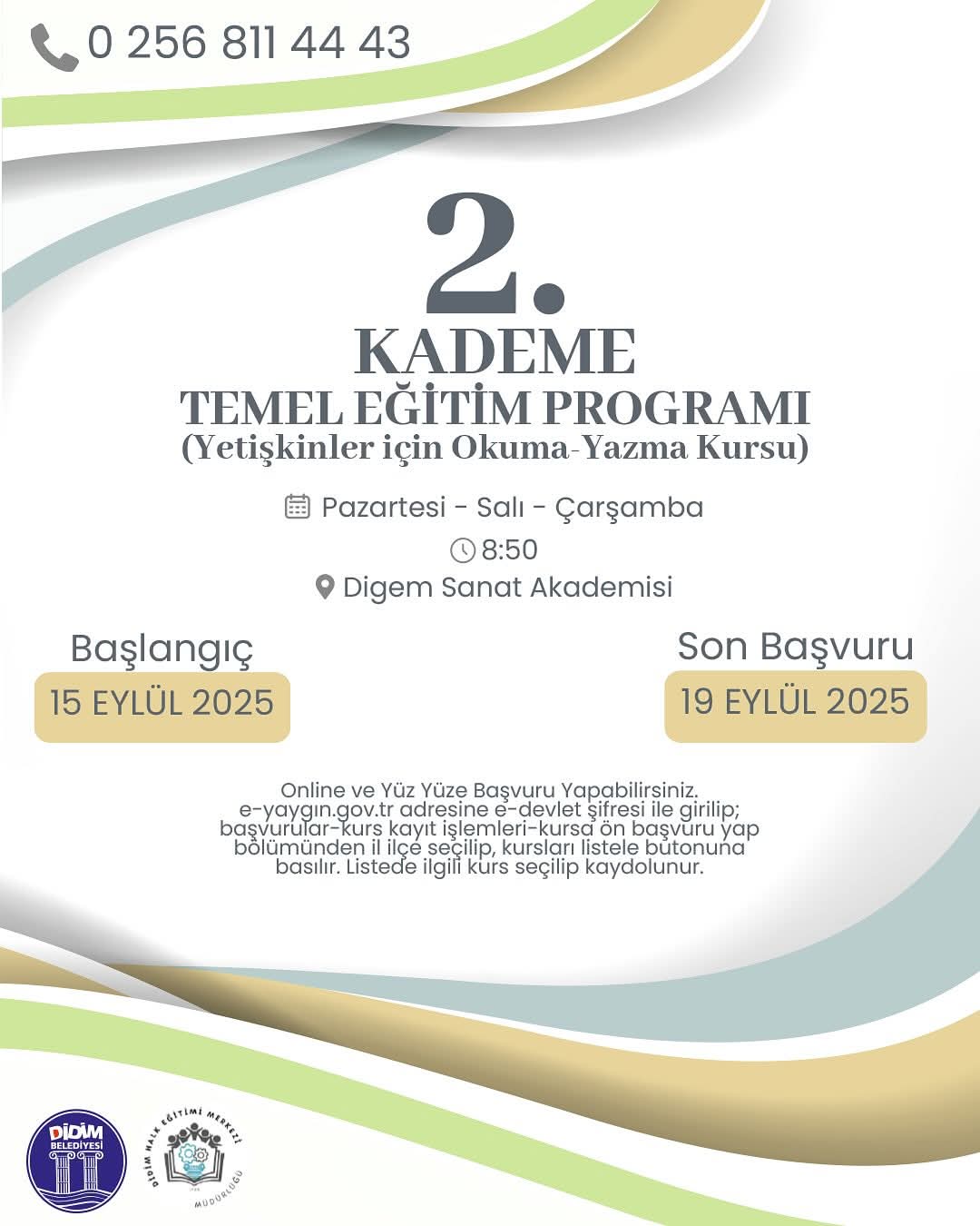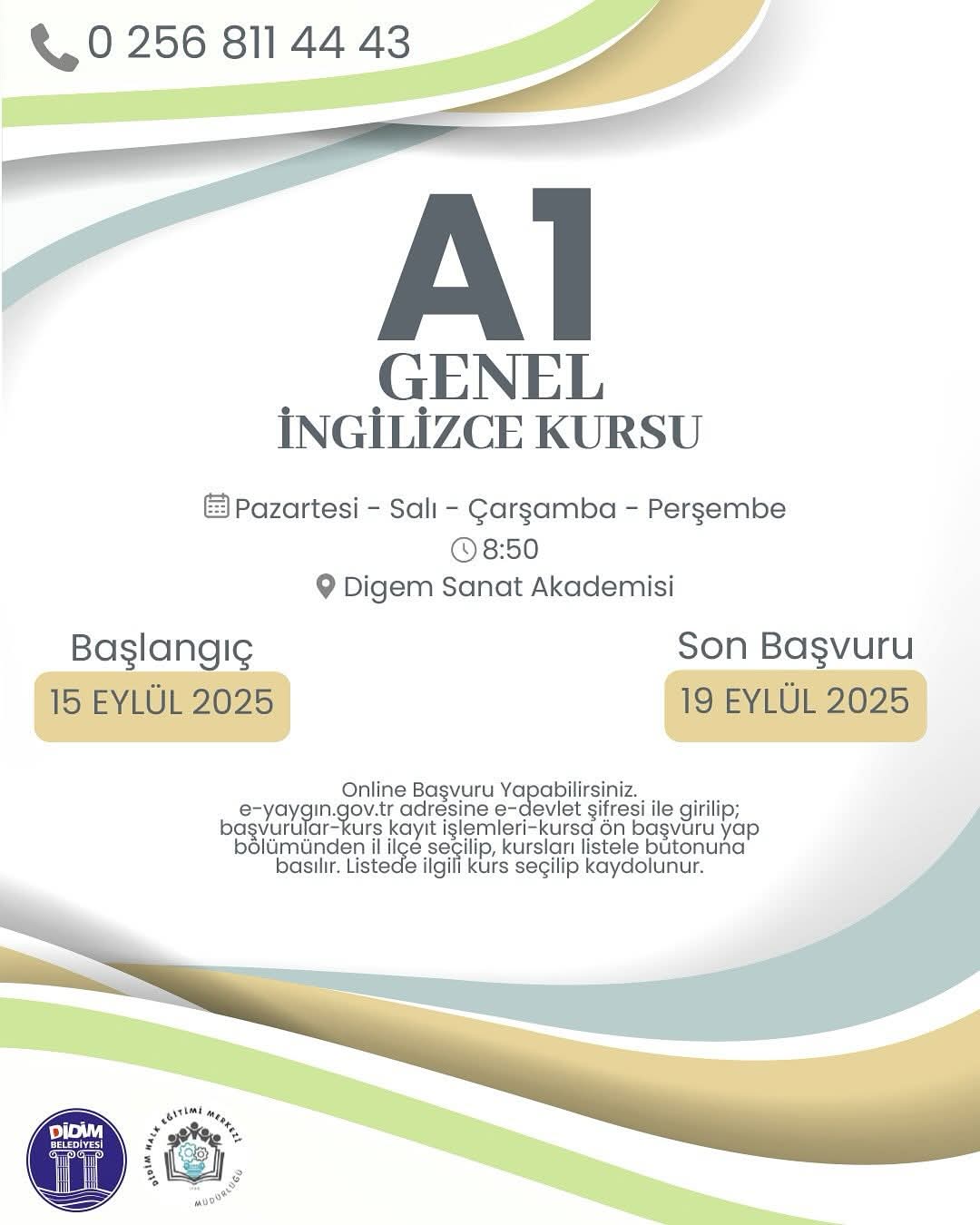 Didim Belediyesi ile Didim Halk Eğitimi Merkezi iş birliğiyle, vatandaşlara yönelik kişisel ve mesleki gelişim için kurslar düzenleyecek. Dil öğrenmek isteyenlerden okuma yazma becerilerini geliştirmek isteyenlere kadar geniş bir yelpazede açılacak kurslar, Online olarak başvuru yapılacak. Detaylı bilgi için 0256 811 44 43 numaralı telefondan bilgi alınabilir.