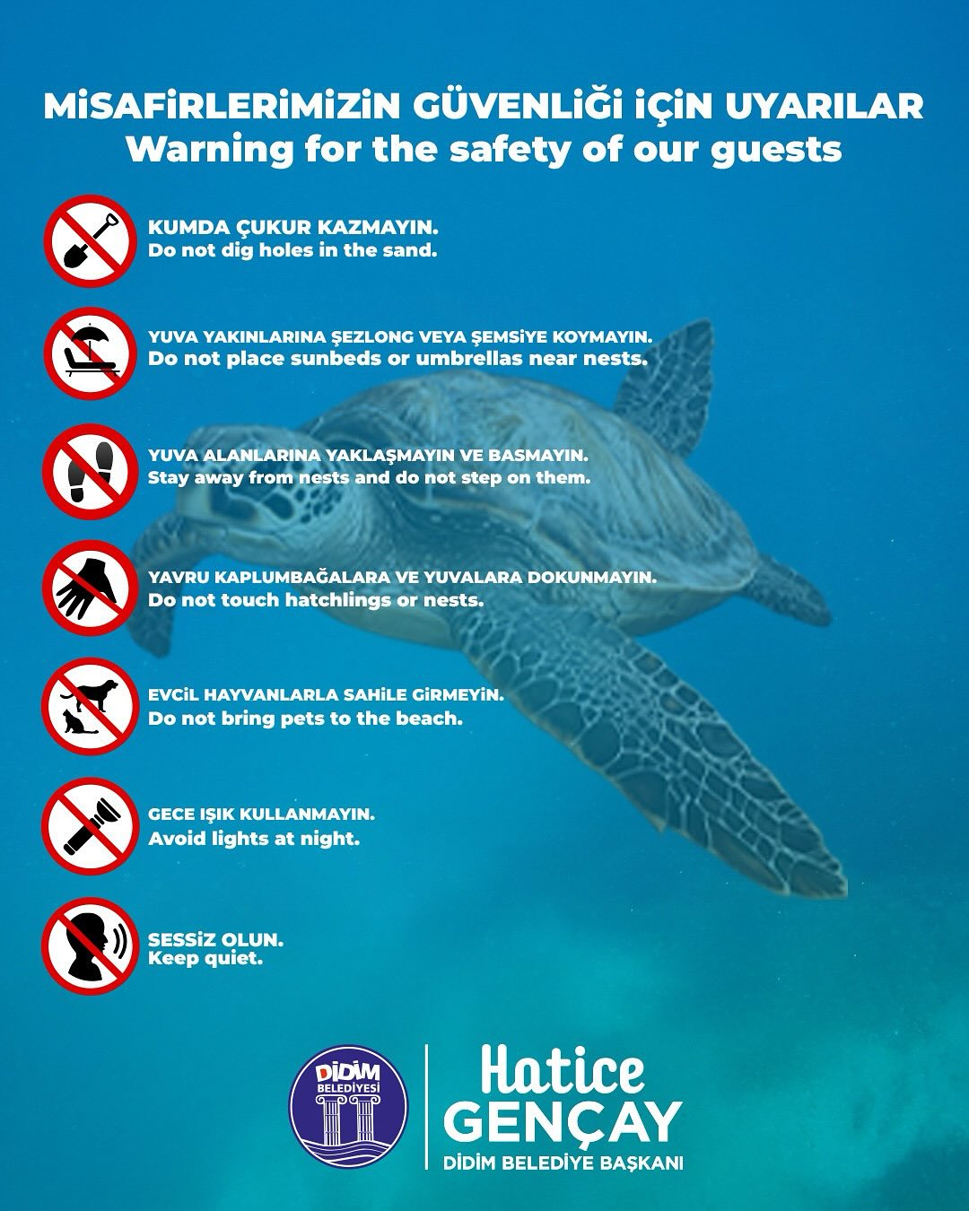 Yapılan paylaşımda “Didim Belediyesi olarak doğayı, denizi ve canlılarını korumayı ortak sorumluluğumuz görüyoruz. Nesli tükenme tehlikesi altındaki Caretta Caretta kaplumbağalarının yumurtlama döneminde geçici istasyon görevimizi üstleniyor, Aydın Doğa Koruma ve Milli Parklar Müdürlüğü ile EKODOSD iş birliği içinde hareket ediyoruz. Geçtiğimiz yıl 5 anne Caretta Caretta’yı güvenle ağırladık, yavrularını denize ulaştırdık. Bu yıl da sahillerimizde daha fazla yavruyu özgürlüğe kavuşturmak için hazırız. Koruma ve izleme DKMP’nin yetkisindedir. Didim Belediyesi ise ilk müdahale ve alan koruma süreçlerinde sahadadır. Görsellerde yer alacak uyarılara dikkatle uymanız büyük önem taşır. Sahillerimizde Caretta Caretta görüldüğünde ilk başvuru noktası Didim Belediyesi’dir.444 81 09 / 153 Zabıta Yetkisiz kişi ve derneklere itibar etmeyiniz.” denildi.