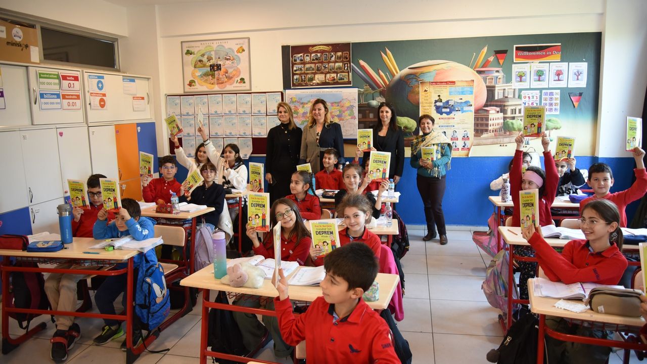 Öğretmen ve öğrencilere Didim Ticaret Odası Başkanı Hilmi Erbaş ve Yönetim Kurulu Üyelerinin selamını ileten Kadın Girişimciler Kurulu Üyesi ve Eğitimci İlknur Güdücü, çocuklara depremin oluşumu ile deprem öncesi ve sonrasında yapılması gerekenler hakkında sorular sordu, bilgilendirmelerde bulundu.