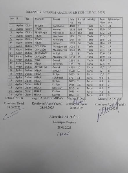 Arazi Kiralama Komisyonu tarafından belirlenen listede Didim'de üst üste iki yıl ve üzeri ekilmeyen, işlenmeyen muhtelif yerlerdeki 21 parsel, toplamı 306 dekar tarlalar kiraya verilmek üzere mahalle muhtarlıklarında askıya çıkartıldı.
