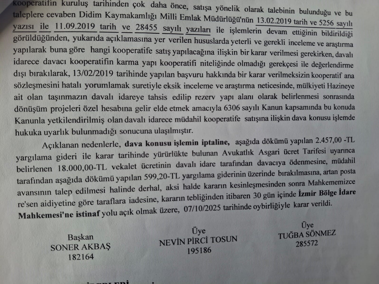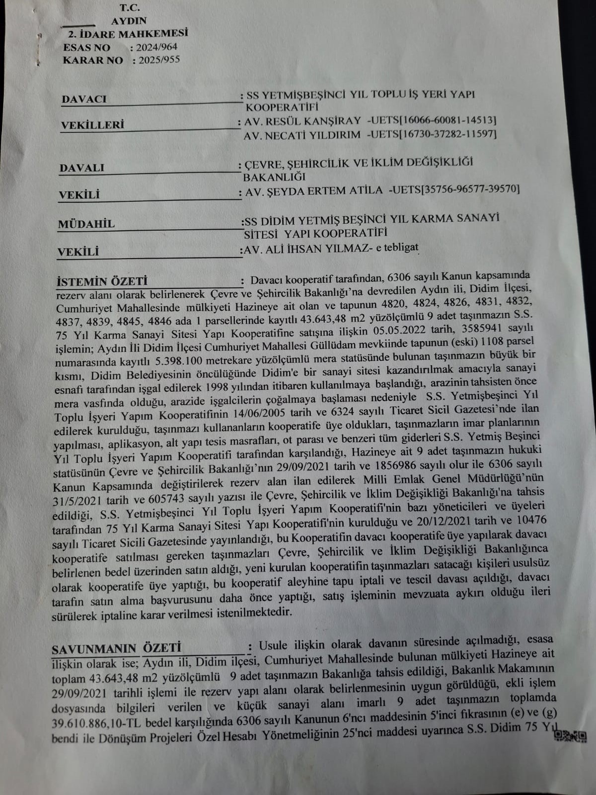 Yıldız açıklamasında 25 Temmuz 2019 yılında bütün sanayideki parsellerin satın alınmasıyla ilgili olarak o günkü kooperatif yönetimine yetki verildiğini kaydederek “Bu yetkiye göre alınması gereken parseller içerisindeki 9 parsel, o günkü mevcut yönetim tarafından ayrı bir kooperatif kurularak satın alınmıştır. 75. Yıl toplu işyeri kooperatifi üyeleri dışında diğer insanlara satılmak suretiyle haksız kazanç sağlanmıştır. Kurmuş oldukları bu kooperatifin 75. Yıl sanayi sitesinin bir üyesi gibi gösterilmiştir. 24-02-2024 tarihinde üyelerin olağan genel kurul talebiyle yeni bir yönetim seçildi. Yeni yönetim kurulu olarak eski yönetim kurulunun aleyhine tapu iptal ve tescil davası ile Aydın İdare Mahkemesine satıl iptali davası açıldı. Bu dava 2024 yılında açıldı. Açılan dava neticesinde 2025/955 karar sayılı ile dava konusu işlemin iptaline oy birliğiyle karar verildi. Bu karar ile eski yönetim kurulunun (Mehmet Şahin ve yönetimi) 9 parseldeki satışı iptal edilmiştir. Bölge İdare Mahkemesinin aldığı kararda hemen uygulanması gerekli kararlar olduğundan Didim Belediye Başkanlığına inşaatların durdurulması ve ruhsatların iptali için müracaat yapılmış, ve mevcut 9 parseldeki incelemenin neticesinde 30 Ekim 2025 tarihinde 5 adet inşaat mühürlenmiştir. Muhtemelen ruhsat iptali de davanın sonucuna göre gerçekleştirilecektir.” dedi.