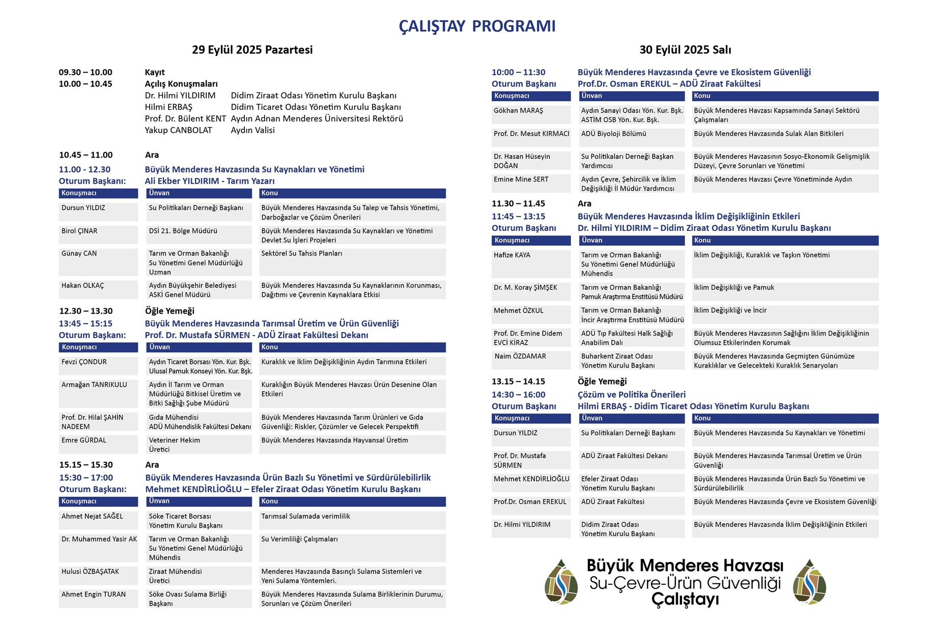 Aydın Valisi Yakup Canbolat’ın teşrifleri ile 29-30 Eylül 2025 tarihlerinde Ankara Üniversitesi Didim ÖRSEM Tesislerinde yapılacak çalıştayda; Büyük Menderes Havzasında Su Kaynakları ve Yönetimi, Büyük Menderes Havzasında Tarımsal Üretim ve Ürün Güvenliği, Büyük Menderes Havzasında Ürün Bazlı Su Yönetimi ve Sürdürülebilirlik, Büyük Menderes Havzasında Çevre ve Ekosistem Güvenliği, Büyük Menderes Havzasında İklim Değişikliğinin Etkileri, Çözüm ve Politika Önerileri başlıklarında 6 farklı oturum olacak.