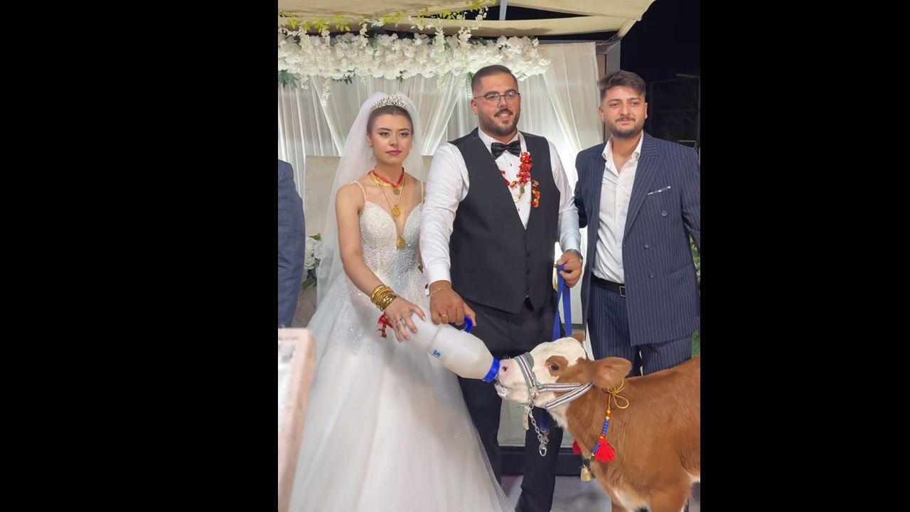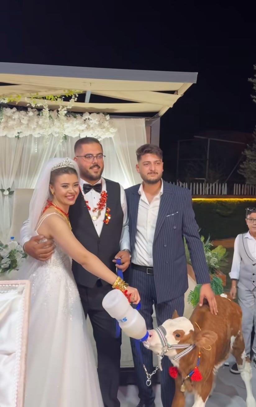 Rukiye ve Nusret Akdeniz’in oğlu Doğukan Akdeniz ile Levent ve Yasemin Çavuş’un kızı Meltem Çavuş’un düğünü, İncirliova’daki bir düğün salonunda gerçekleştirildi. Takı töreninde damada, abisi Ahmet Akdeniz, ortağı Mustafa Aydemir ve arkadaşları tarafından mesleğine uygun sürpriz bir hediye hazırlandı. Alışılmışın dışında bir hediye tercih edilirken, gelin ve damat kendilerine hediye edilen buzağıyı gülümseyerek teslim aldı ve biberonla besledi. Davetliler, buzağı sürprizini tebessümle izlerken, düğünde renkli ve eğlenceli anlar yaşandı.