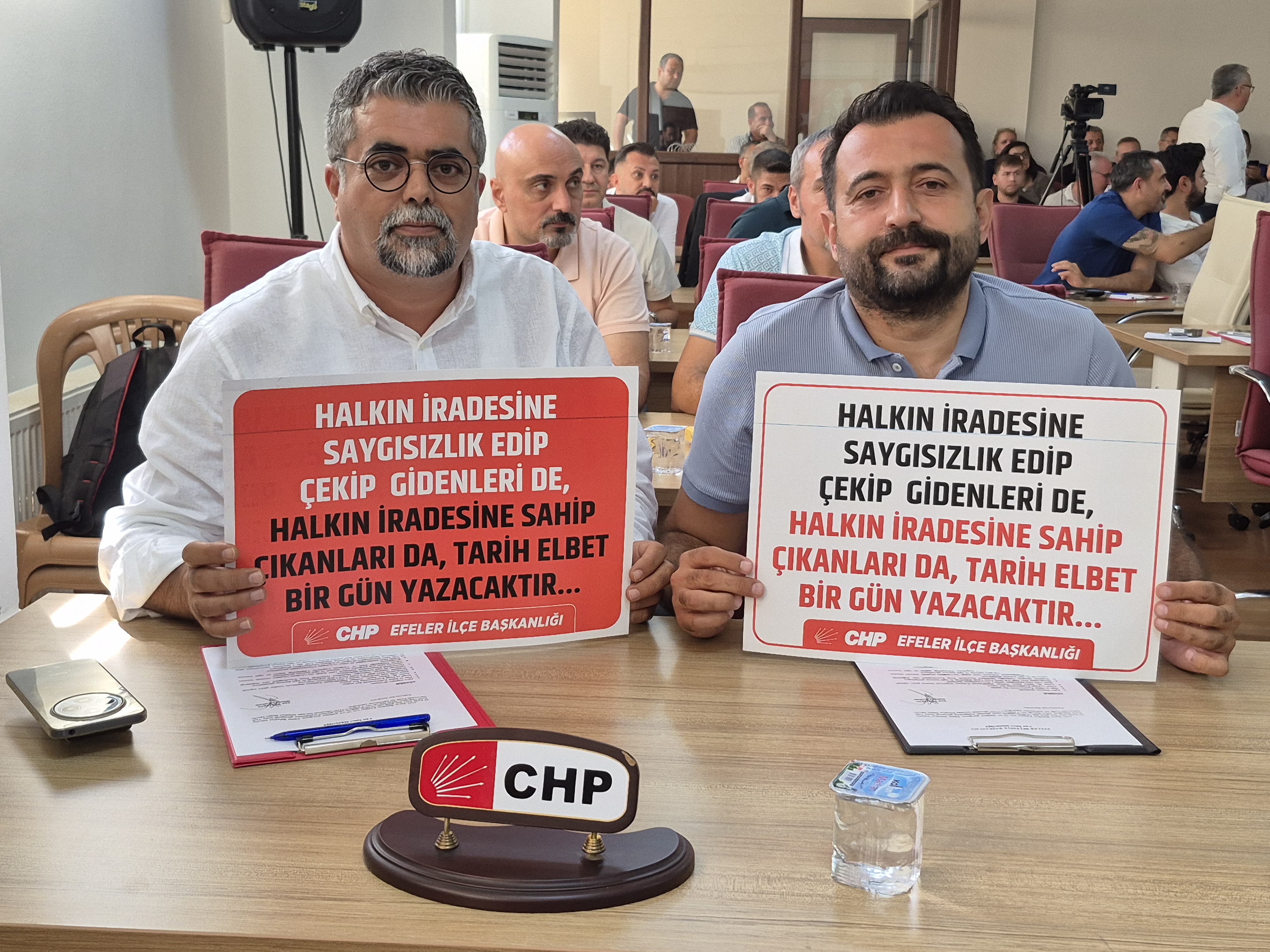Aydın’ın Efeler ilçesinde Belediye Meclisi eylül ayı oturumu için toplandı. Belediye Başkanı Anıl Yetişkin'in başkanlığında gerçekleşen oturum öncesinde CHP'li meclis üyeleri Yusuf Metin Diler ve İbrahim Bozkurt, döviz açtı. CHP'li üyeler Diler ve Bozkurt, açtıkları dövizle CHP'den AK Parti’ye geçen Aydın Büyükşehir Belediye Başkanı Özlem Çerçioğlu’na göndermede bulundu. Dövizde şu ifadelere yer verildi: "Halkın iradesine saygısızlık edip çekip gidenleri de halkın iradesine sahip çıkanlara da tarih elbet bir gün yazacaktır"