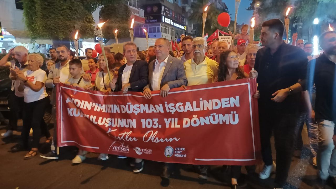 Saat 19.30’da İstasyon Meydanı’ndan başlayan yürüyüşe CHP Aydın Milletvekili Evrim Karakoz, Efeler Belediye Başkanı Anıl Yetişkin, CHP Efeler İlçe Başkanı İsmet Bozkurt ile birlikte binlerce vatandaş katıldı. Vatandaşlar meşaleler ve Türk bayraklarıyla Efeler’i kırmızı beyaza bürüdü.