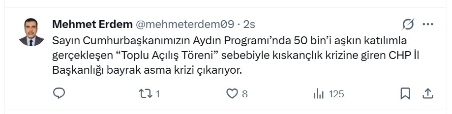 “50 bin’i aşkın katılımla gerçekleşen Toplu Açılış Töreni sebebiyle kıskançlık krizine giren CHP İl Başkanlığı bayrak krizi çıkarıyor” ifadelerini kullandı.