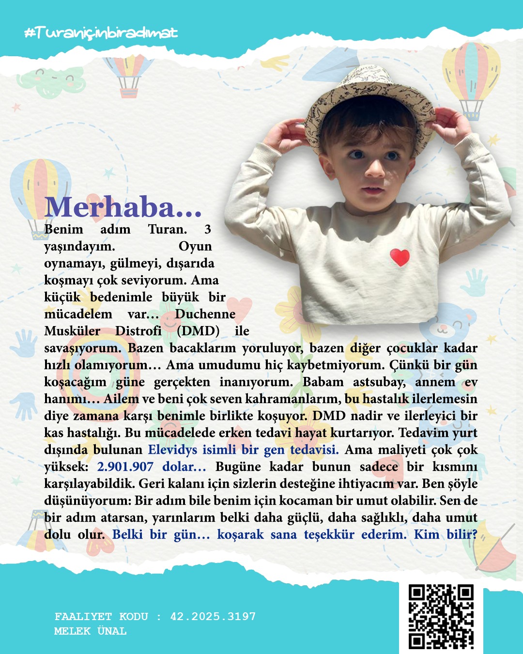 Hava astsubayı Nevzat Ünal ve ev hanımı Melek Ünal çifti, ilk çocukları olan 3 yaşındaki Turan Ünal’ın 6 aylıkken sergilediği davranışlardan şüphelenerek hastaneye başvurdu. Kuyucak Esnaf ve Sanatkârlar Odası üyesi olan ve Beşeylül Mahallesi’nde kahvehane işleten Ayşen Gül’ün torunu olan minik Turan’a yapılan tetkikler sonucunda DMD (Duchenne Musküler Distrofi) teşhisi konuldu. Babaanne Ayşen Gül de torunu için sokak sokak gezerek destek ararken komşu ilçeler de ellerinden geleni yapmak için kolları sıvadı. Görev yeri nedeniyle Konya’da bulunan aile, Turan bebeğin tedavisi için gerekli 3 milyon 200 bin doları toplamak amacıyla 31 Mayıs’ta Valilik onaylı bir yardım kampanyası başlattı. Turan bebek için ailesi Konya’da, babaannesi de Aydın’da seferber oldu.