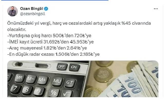 2025 yılına dair vergi, harç, araç muayene ve cezalardaki artış oranları netleşmeye başladı. Vergi Uzmanı Ozan Bingöl, sosyal medya platformu X üzerinden yaptığı açıklamada, bu zam oranlarının yaklaşık %45 olacağını duyurdu.