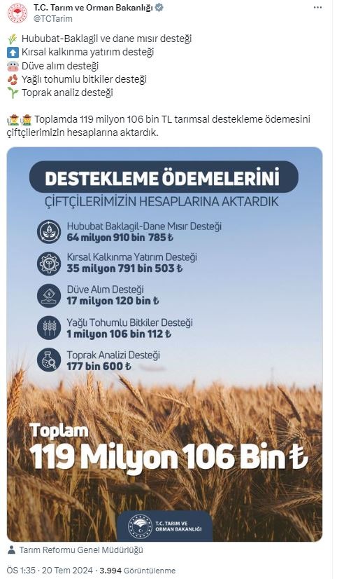 Tarım ve Orman Bakanlığı'nın sosyal medya hesaplarından yapılan açıklamaya göre, bu ayki destek ödemeleri hesaplara yatırıldı. Toplamda 119 milyon 106 bin TL tutarındaki tarımsal destek ödemesi bugün itibarıyla çiftçilerin hesaplarına aktarıldı.