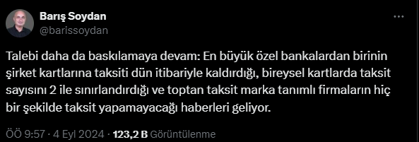 Soydan, paylaşımında şu ifadelere yer verdi: "Talebi daha da baskılamaya devam: En büyük özel bankalardan birinin şirket kartlarına taksiti dün itibariyle kaldırdığı, bireysel kartlarda taksit sayısını 2 ile sınırlandırdığı ve toptan taksit marka tanımlı firmaların hiç bir şekilde taksit yapamayacağı haberleri geliyor."